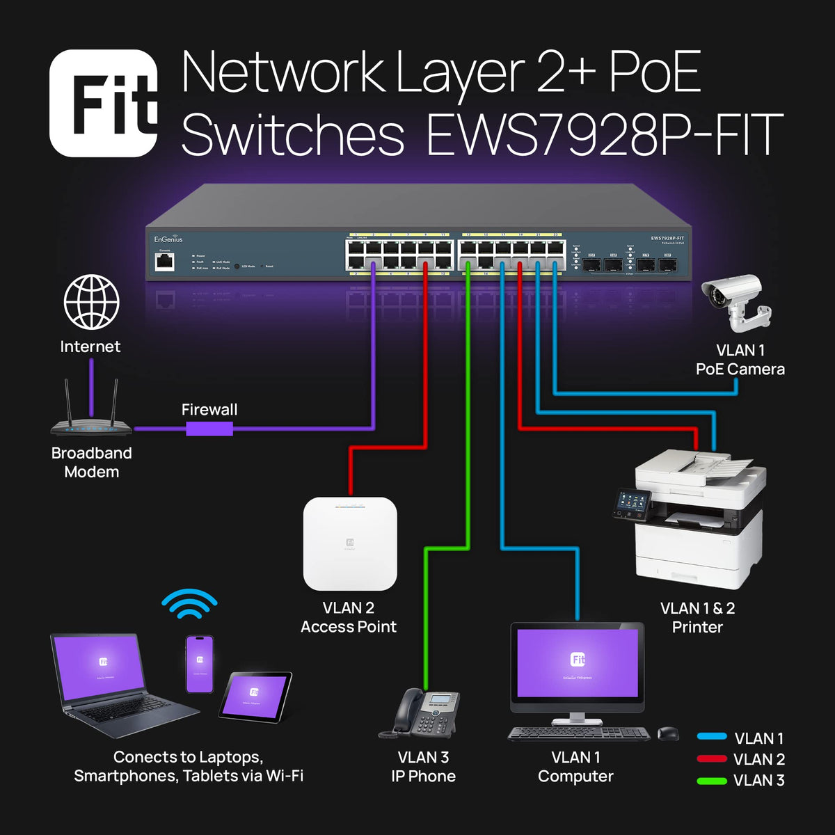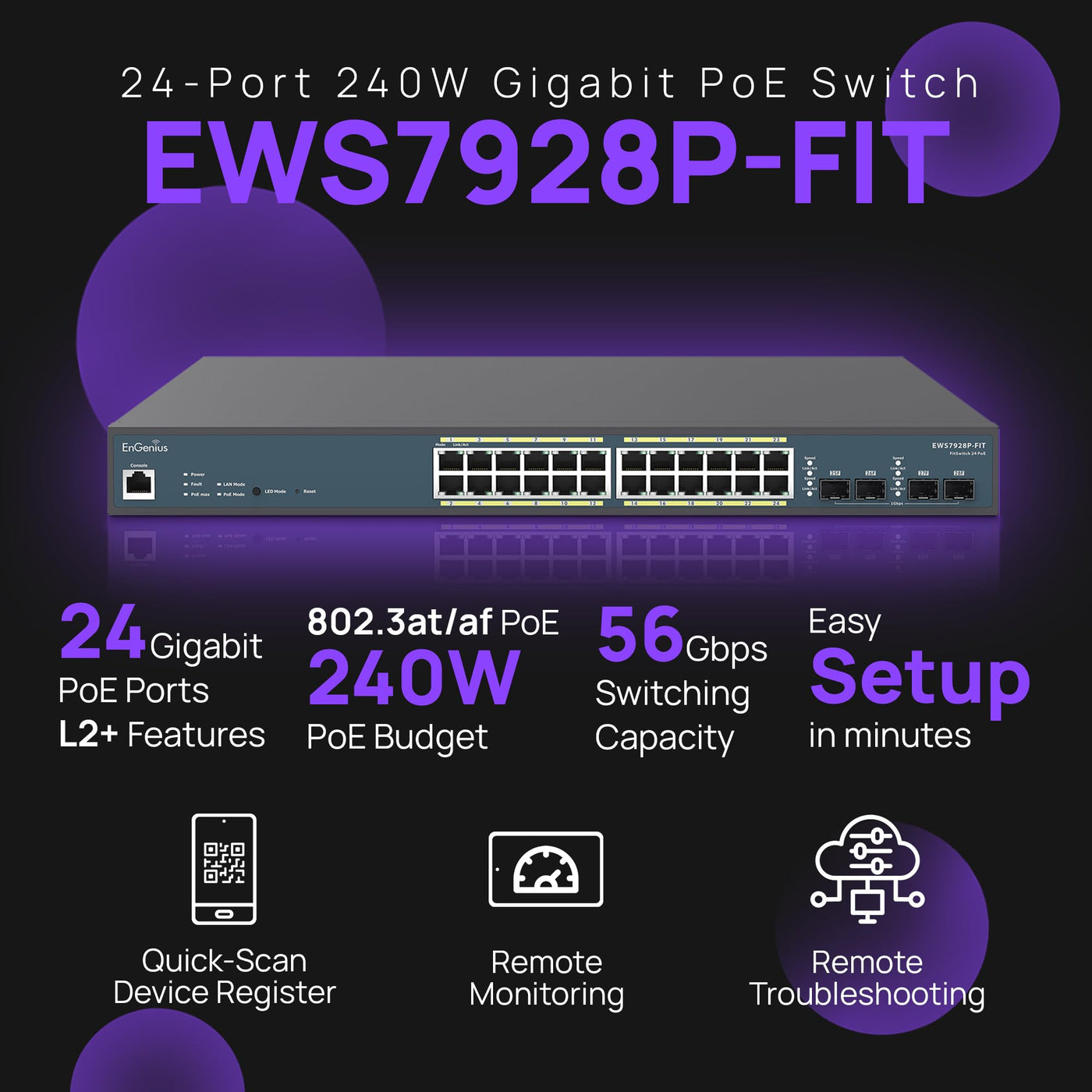 The Engenius Fit Managed Switch Ews7928P-Fit Is The Perfect Solution For Small Business Network Environments. This 24-Port Gigabit Poe+ Layer 2 Plus Switch Comes With A 240W Poe Budget, 4 Sfp Uplink Ports, And Multiple Management Options.