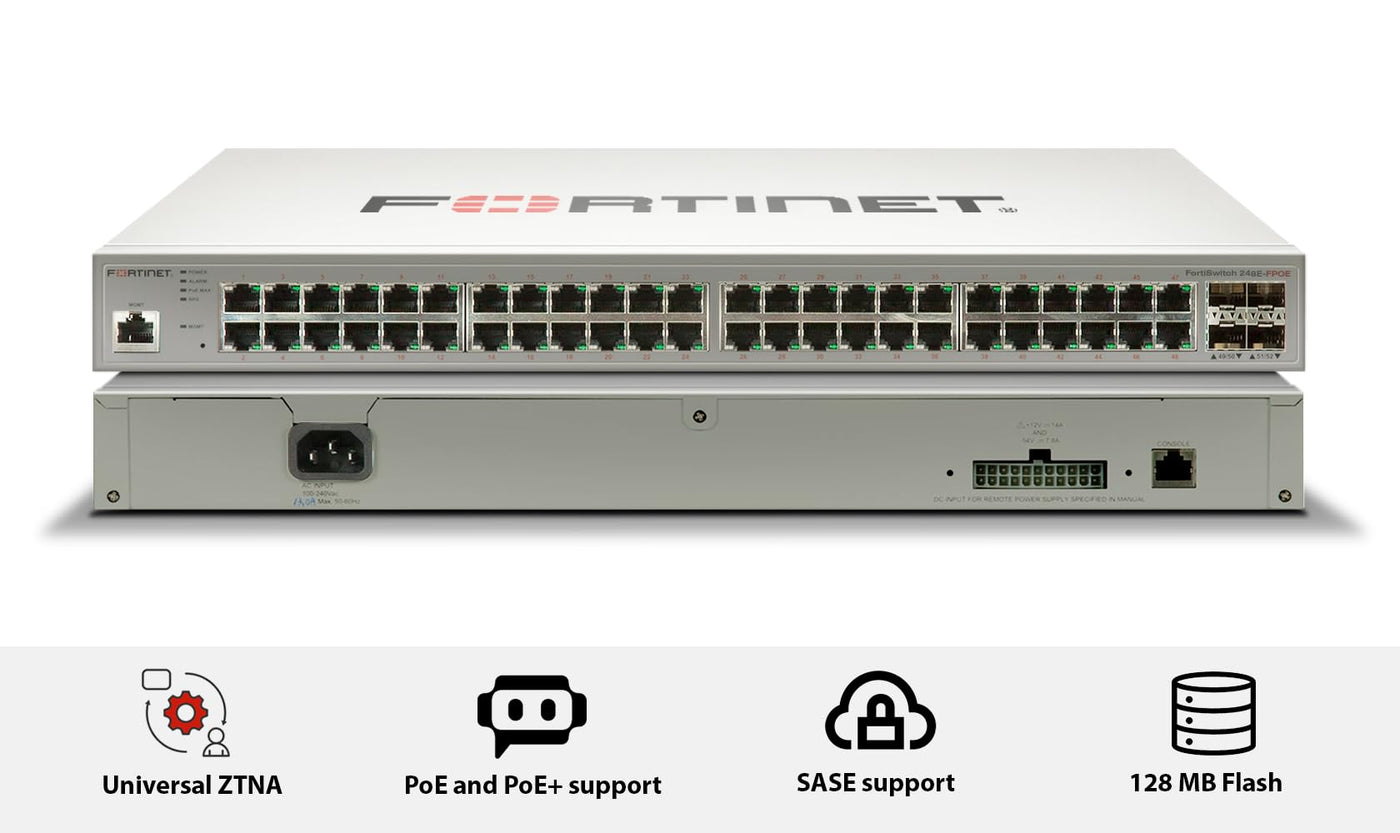 Q: What is the maximum power output of the Fortinet FortiSwitch 248E-FPOE?A: The Fortinet FortiSwitch 248E-FPOE supports Power over Ethernet (PoE+) with a maximum power output of up to 30 watts per port, allowing you to power devices like IP cameras and access points directly through the switch.