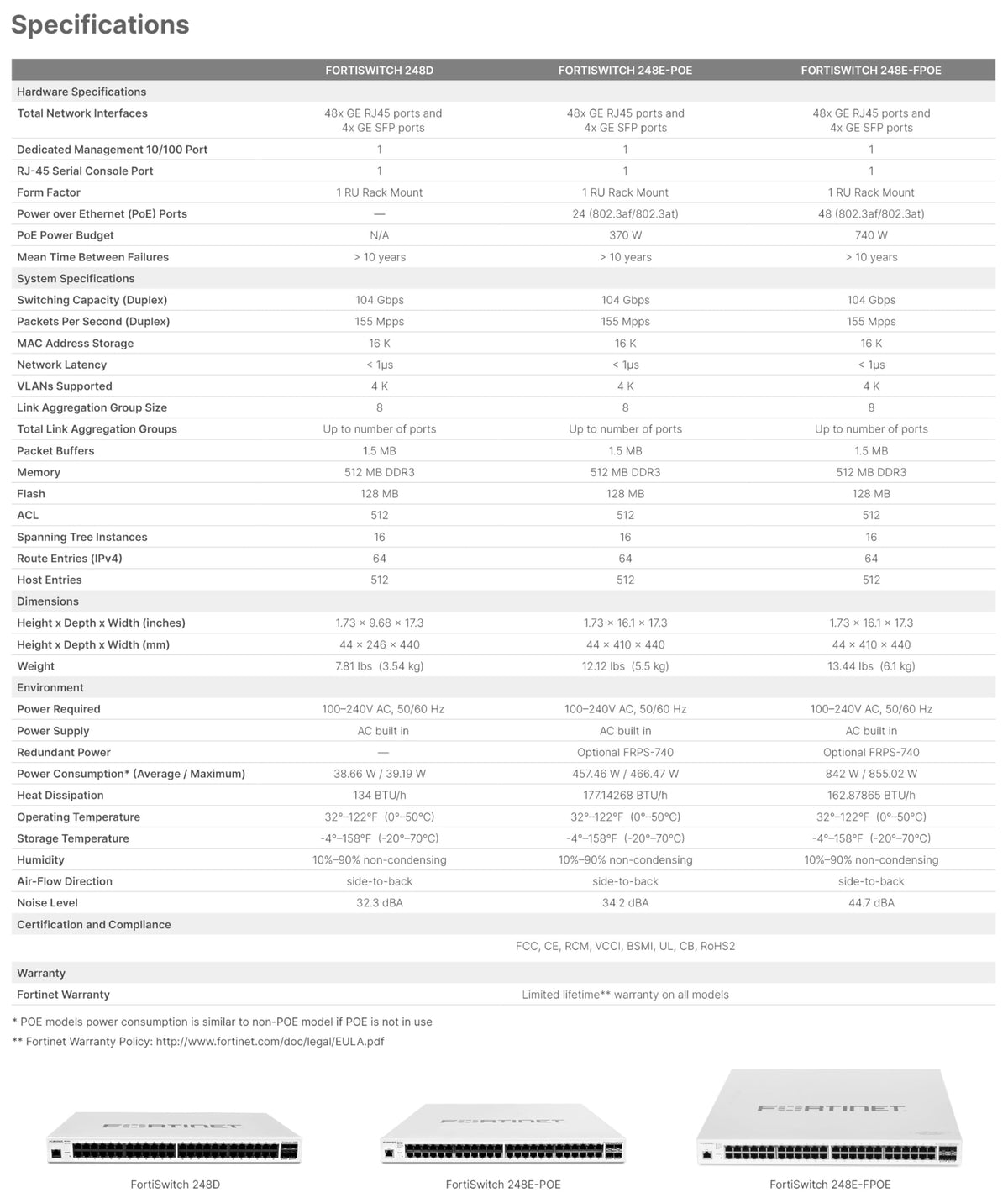 Q: What is the warranty period for the Fortinet FortiSwitch 248E-FPOE?A: The Fortinet FortiSwitch 248E-FPOE typically comes with a limited lifetime warranty, ensuring long-term reliability and support for your networking needs.