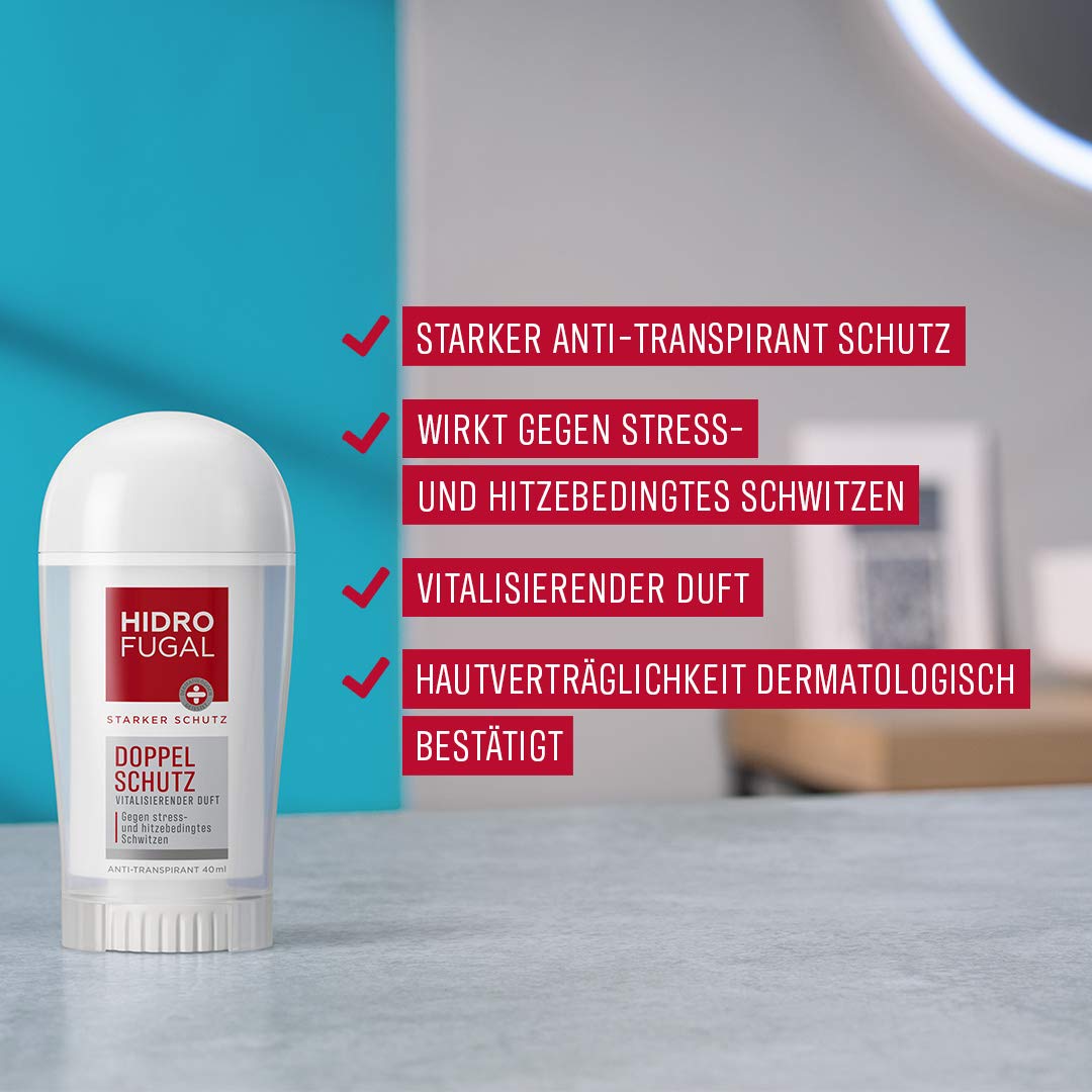 Hidrofugal Doppel Schutz Stick - Der Starke Zweifach-Schutz Gegen Stress- Und Hitzebedingtes Schwitzender Hidrofugal Doppel Schutz Deo Stick Berzeugt Mit Seiner Kombination Aus Zweifach Starkem Schutz Und Einem Vitalisierenden Duft. Die Speziell Entwickelte Formel Des Deo Sticks Hilft Gleich Zweifach Bei Stress- Und Hitzebedingtem Schwitzen: Es Wirkt Besonders Zuverlssig Gegen Unangenehmen Krpergeruch Und Achselnsse. Das Anti-Transpirant Ist Ohne Ethylalkohol Besonders Sanft Zur Haut Und Seine Hautvertrglichkeit Ist Dermatologisch Besttigt.Anwendung: Unter Den Achseln Auftragen Und Trocknen Lassen. Nicht Auf Gereizter Oder Geschdigter Haut Anwenden.Die Produktvorteile Im Berblick: Vitalisierender Duft Anti-Transpirant Stick Mit Besonders Zuverlssigem Schutz Wirkt Zweifach Gegen Stress- Und Hitzebedingtes Schwitzen Ohne Ethylalkohol Hautvertrglichkeit Dermatologisch Besttigt