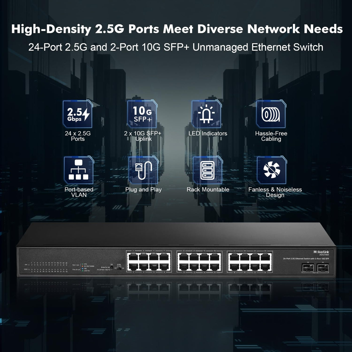 Mokerlink 24 Port 2.5G Ethernet Switch With 2X10G Sfp, 24 X 2.5G Base-T Ports Compatible With 10/100/1000Mbps, Metal Unmanaged Fanless Network Switch