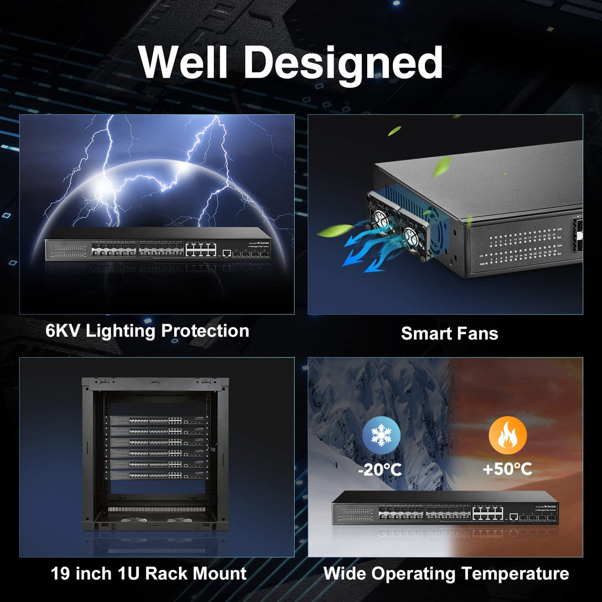 Q: Can this switch be used in enterprise environments?A: Yes, the MokerLink switch is designed for enterprise use, supporting features like VLANs, port security, and monitoring capabilities, making it suitable for complex network infrastructures.