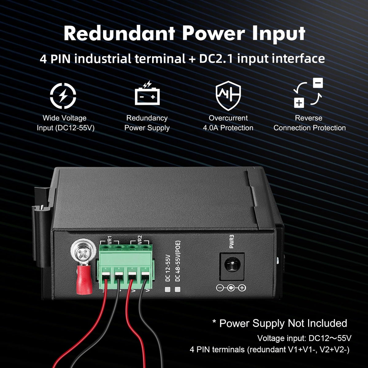 Q: Is a power adapter included with the MokerLink 6 Port Industrial Din Rail Gigabit Switch?A: No, the power adapter is not included with the switch. However, it supports multiple power supply options, including 1 DC power and 2 industrial power (4 pin terminal) connections.