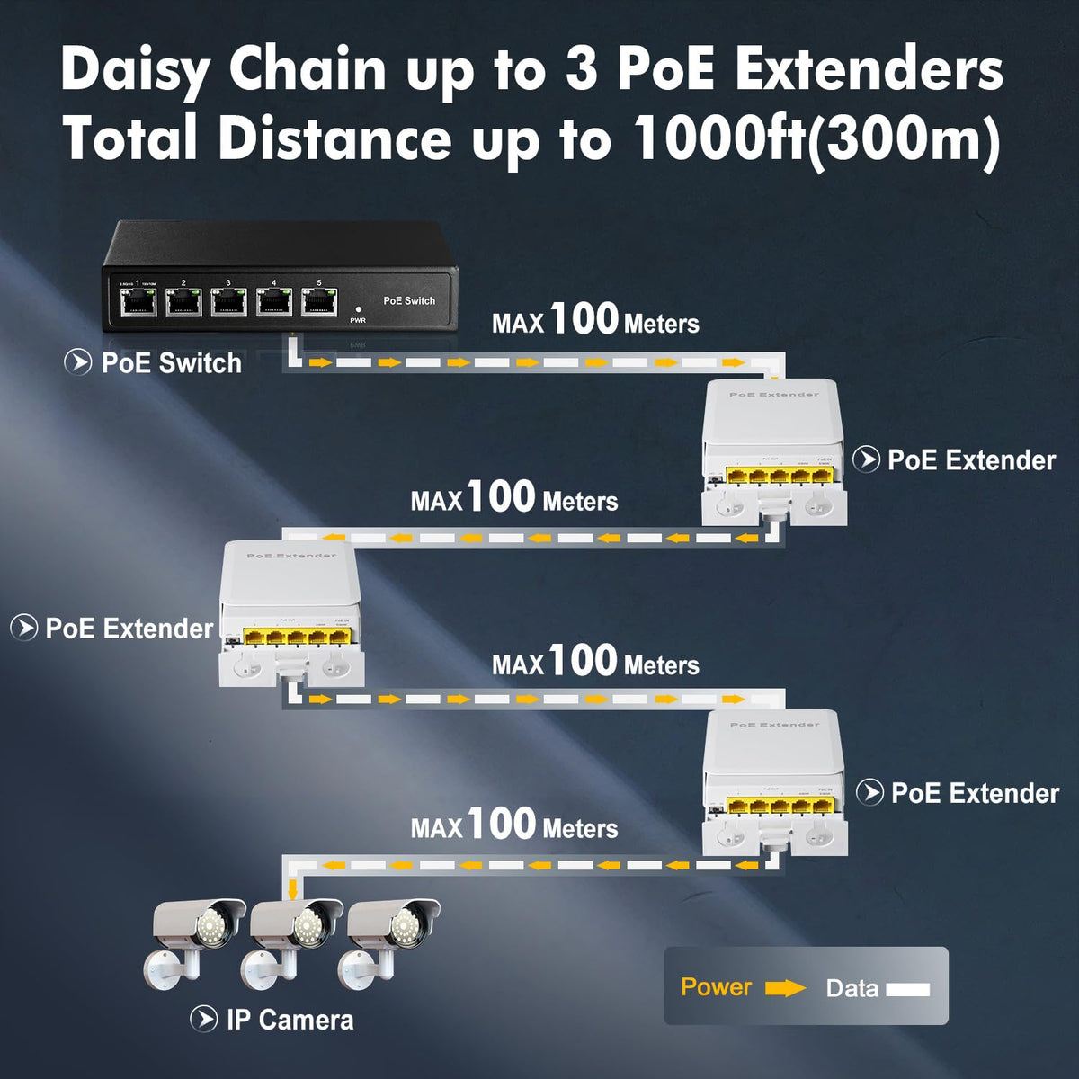 Outdoor Gigabit Poe Passthrough Switch, 1 Poe In 4 Poe Out Extender, Ieee802.3Af/At/Bt Poe Powered 90W, 10/100/1000Mbps Ethernet