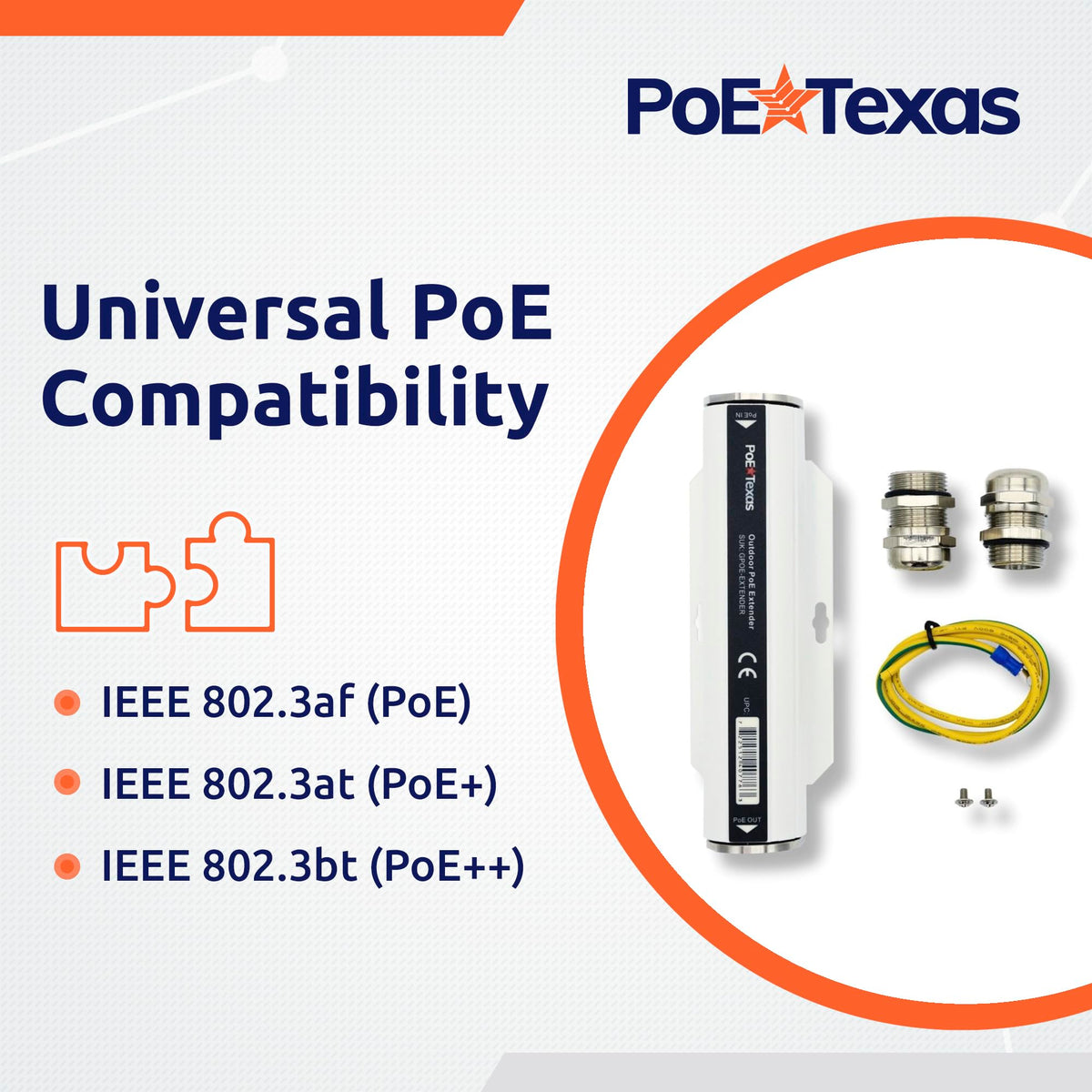 Q: What types of devices can I power using the PoE Texas PoE++ Extender?A: The PoE Texas PoE++ Extender is compatible with a variety of high-power devices, including Wireless Access Points, Base Stations, Network Cameras, and any other devices that support PoE standards such as IEEE 802.3af, 802.3at, and 802.3bt.