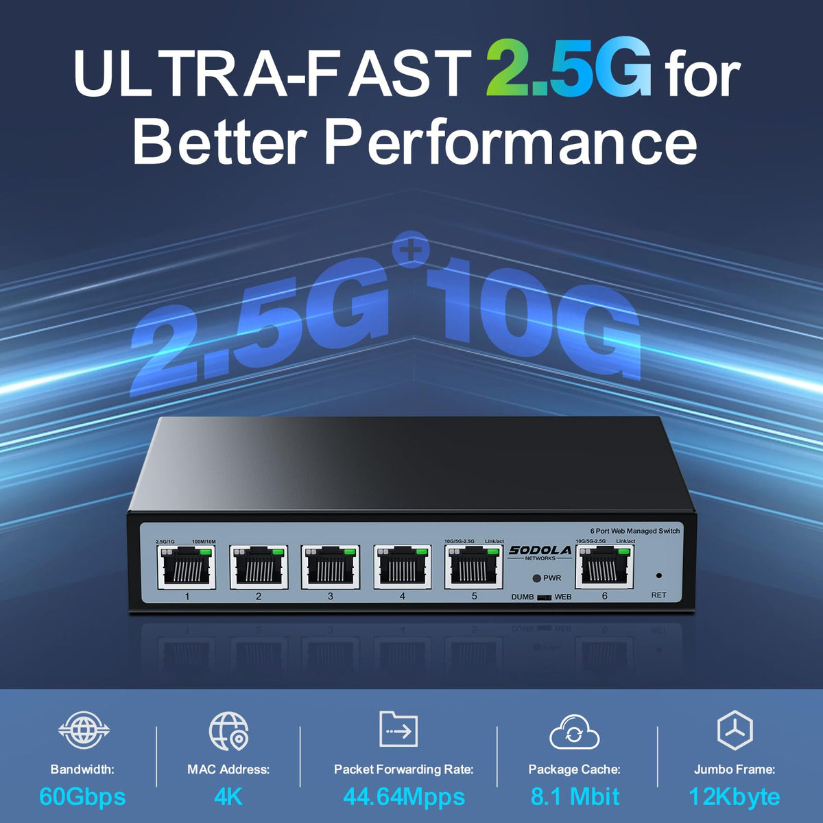 Sodola 2.5Gb Easy Web Managed Switch, 2X10Gbase T Ports And 4X2.5Gbase T Ports, Full Rj45 Managed Ethernet Switch With Link Aggr