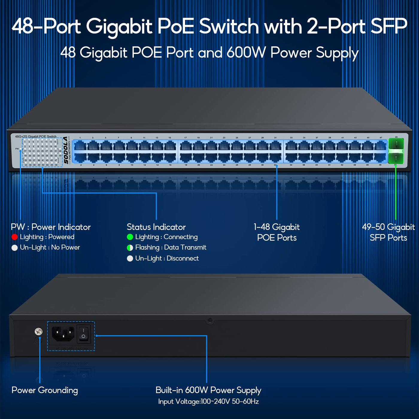 Sodola 48 Port Gigabit Poe Switch, 600W Unmanaged Network Switch With 48 Port Ieee802.3Af/At Poe, 2 X 1G Sfp, Metal Rackmount Un