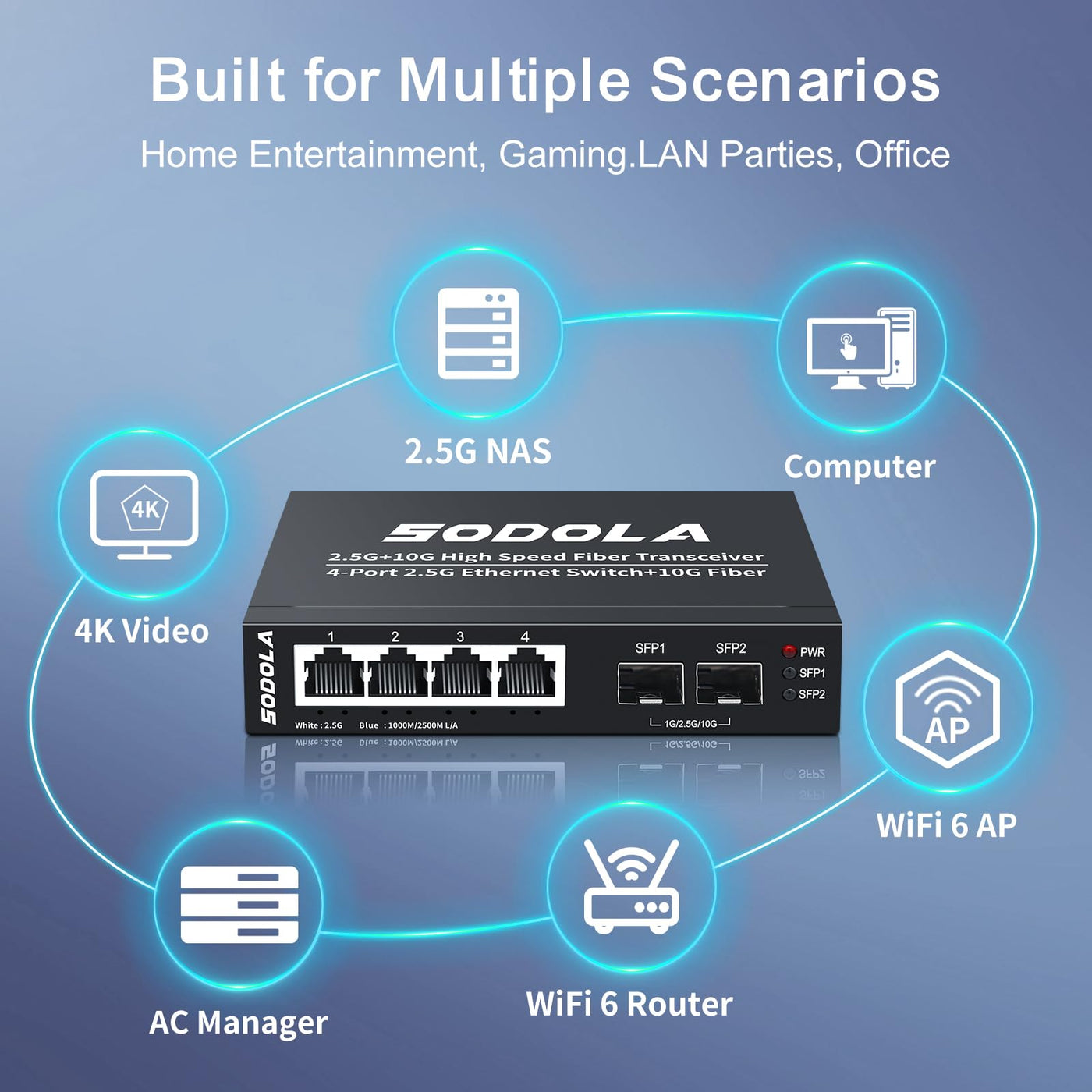 Sodola 6 Port 2.5G Umanaged Ethernet Switch,4X 2.5Gbase T Ports,2X 10G Sfp, 60Gbps Switching Capacity,Mini Wall Mountable 2.5Gb
