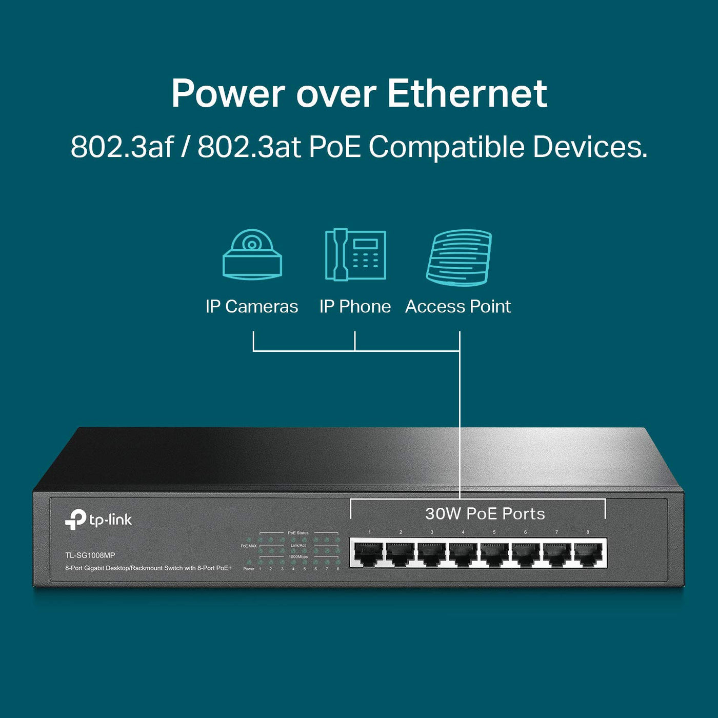 Q: What is the maximum power output per port on the TP-Link TL-SG1008MP?A: The TP-Link TL-SG1008MP provides a maximum power output of up to 30W per port, allowing it to support high-powered devices such as IP cameras and wireless access points.
