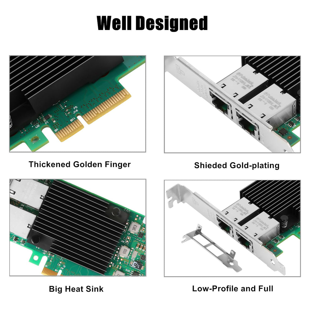 Cabling Type: Rj-45 Category-6 Up To 55M; Category-6A Up To 100M Ethernet Controller: Intel Elx550At2 Data Rate Per Port: 100Mb/1Gbe/2.5Gbe/5Gbe/10Gbe Speed & Slot Width: 8.0 Gt/S, X 4 Lane System Interface Type: Pcie V3.0 (8.0 Gt/S) Intelligent Offloads: Yes Storage Over Ethernet: Iscsi, Fcoe, Nfs Operating Temperature: 0 ? ~ 55 ? (32 F To 131 F) Storage Temperature: -40 ? ~ 70 ? (-40 F To 158 F) Applications Add Two 10 Gigabit Ethernet Ports (10Gbps) To A Client, Server Or Workstation Through One Pci Express Upgrades To Servers Or Workstations In Need Of Enhanced Performance, Advanced Features And Greater Reliability. Upgrade A 10/100/1000 Ethernet Port On Your Computer To 10Gbe Networking. Ideal For High-Demand Database Servers And Mission-Critical Systems That Need Redundant Network Connectivity. Add Networking Capabilities To An Old System With No Ethernet Port.
