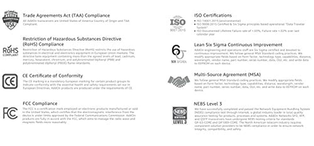 Addons Cisco Glc-Sx-Mmd Compatible Sfp Transceiver Provides 1000Base-Sx Throughput Up To 550M Over Multi-Mode Fiber (Mmf) Using A Wavelength Of 850Nm Via An Lc Connector It Is Guaranteed To Be 100% Compatible With The Equivalent Cisco Transceiver This Easy To Install, Hot Swappable Transceiver Has Been Programmed, Uniquely Serialized And Data-Traffic And Application Tested To Ensure That It Will Initialize And Perform Identically Digital Optical Monitoring (Dom) Support Is Also Present To Allow Access To Real-Time Operating Parameters This Transceiver Is Trade Agreements Act (Taa) Compliant We Stand Behind The Quality Of Our Products And Proudly Offer A Limited Lifetime Warranty At Addon, All Of Our Network Transceivers Are Fully Compliant To Msa Standards We 100% Code And Test Every Transceiver At Our In-House Lab To The Original Oem Specifications As Well As Testing In-Environment - A Discipline Above And Beyond What Even The Original Manufacturer Would Do We Offer The Most Comprehensive Portfolio Of Compliant Transceivers In The Industry Our Proprietary Data Traveler System Ensures All Addon Transceivers Go Through The Same Rigorous Process Before They Are Packed And Shipped