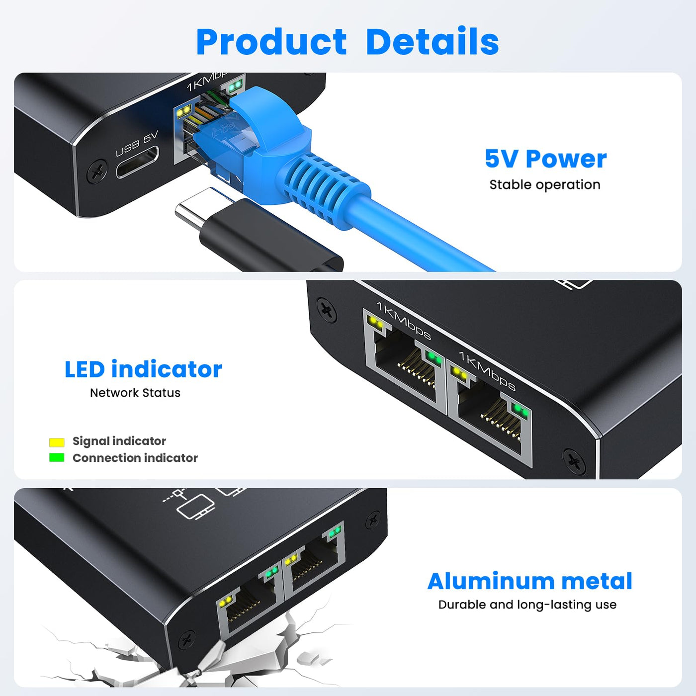 Gigabit Ethernet Splitter 1 To 2 High Speed 1000Mbps, Lan Network Splitter With Usb Power Cable, Gigabit Rj45 Internet Ethernet