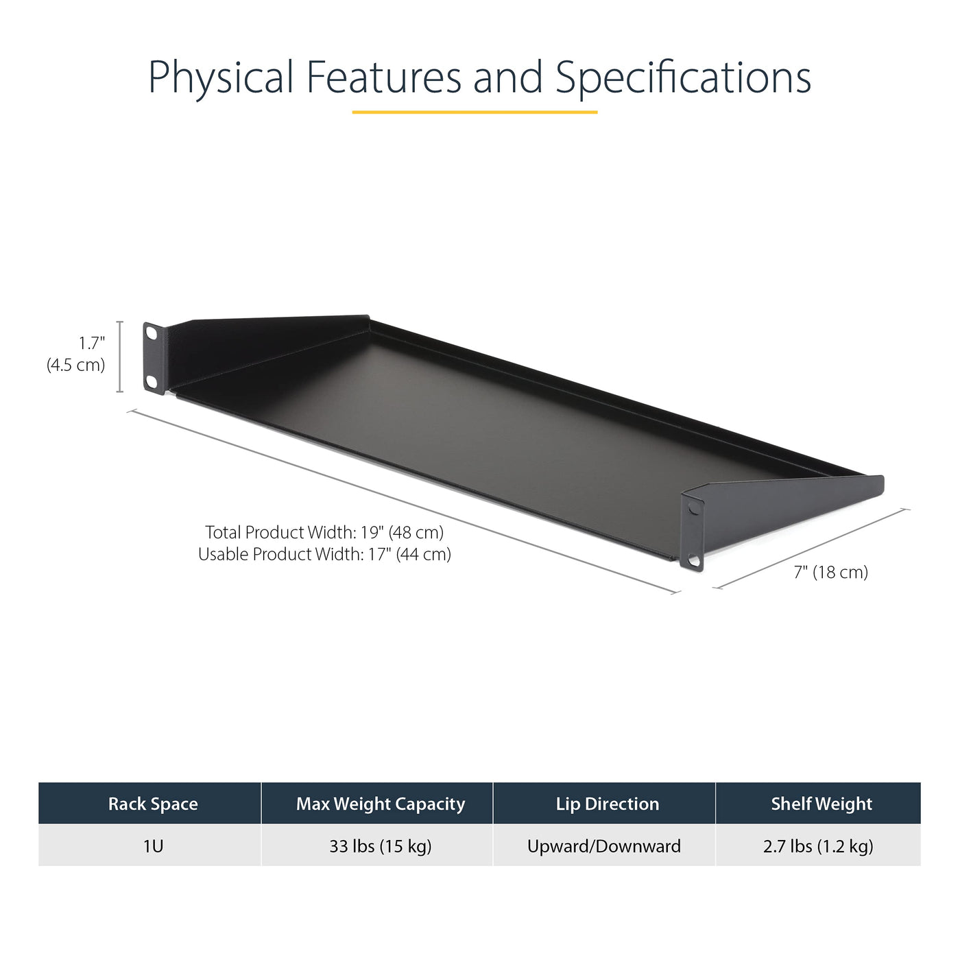 Shipping Height: 197 Shipping Width: 22 Master Pack Qty: 1 General Information Manufacturer: Startechcom Manufacturer Part Number: Cabshelf1U Brand Name: Startechcom Product Name: 19 1U Universal Fixed Server Rack Cabinet Shelf Marketing Information: The Cabshelf1U 1U (Black) Universal Fixed Server Rack Cabinet Shelf Lets You Add A Compact Fixed Storage Shelf To Any Standard 19-Inch Server Rack Or Cabinet With Front Mount Options Constructed Using Spcc Commercial Grade Cold-Rolled Steel, This Durable Fixed Rack Shelf Can Hold Up To 15Kg (33Lbs) Of Equipment - A Perfect Solution For Storing Small Form Non-Rackmount Equipment, Tools, Peripherals Or Accessories In Your Rack, To Keep Them Readily Accessible Backed By A Startechcom 2-Year Warranty Product Type: Rack Shelf Physical Characteristics Material: Steel Height: 17 Width: 190 Depth: 70 Form Factor: 19 1U Weight (Approximate): 265 Lb Miscellaneous Package Contents: 19 1U Universal Fixed Server Rack Cabinet Shelf 4 X M6 Cage Nut 4 X M6 Cabinetscrew Warranty Standard Warranty: 2 Year
