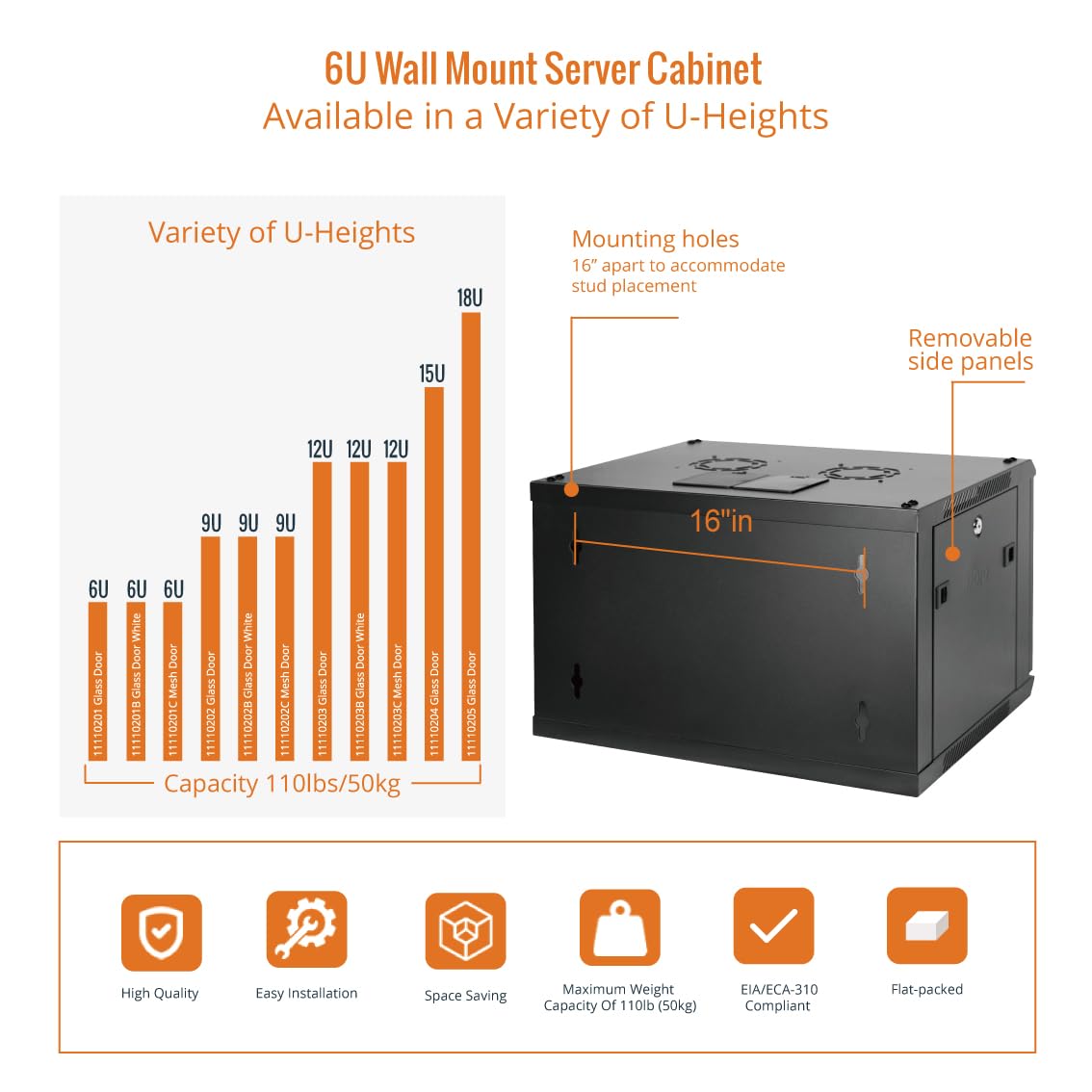 Tecmojo Wall-Mount Cabinets Are Designed To House, Secure And Organize The Eia-Standard 19-Inch Rack Devices In Classrooms, Retail Environment, Offices, And Other Locations With Limited Floor Space. The Frame Is Made From High Quality Cold Rolled Steel. The Front Door Has Glass And Steel Mesh Option. Sturdy Electro-Static Powder Coating Provides Exceptional Durability On The Finish And Can Resist Conditions Found In Non-It Environments Such As Warehouses And Other Retail Locations. The Enclosure Is Pci & Hippa Compliant With Locking Door And Side Panel To Protect Your Critical Network Equipment And Help Prevent Unauthorized Access. Front Door Can Be Installed On Either Side Of The Front Cabinet To Satisfy Your Door Swing Orientation Preference. This Unit Comes Flat Packed With Hardware For Equipment Mounting. Easy Assembly Is Required. Available In 6U, 9U,12U, 15U And 18U Configurations.
