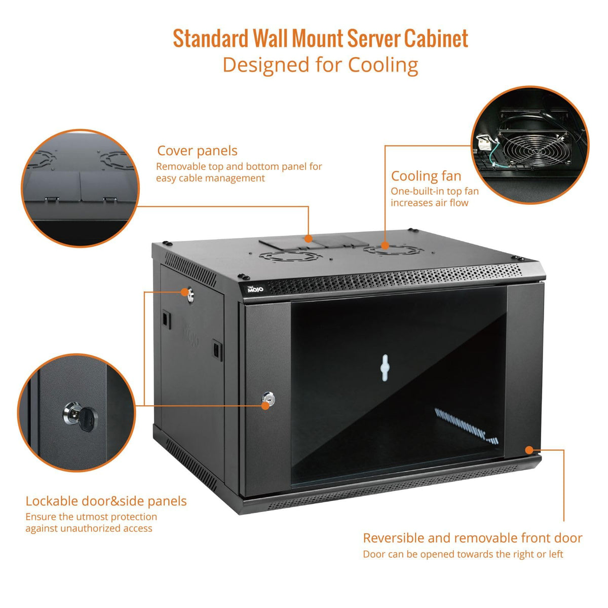 Tecmojo 6U Wall Mount Server Cabinet It Network Rack Enclosure Lockable Door And Side Panels Black,Cooling Fan,Standard Glass Do