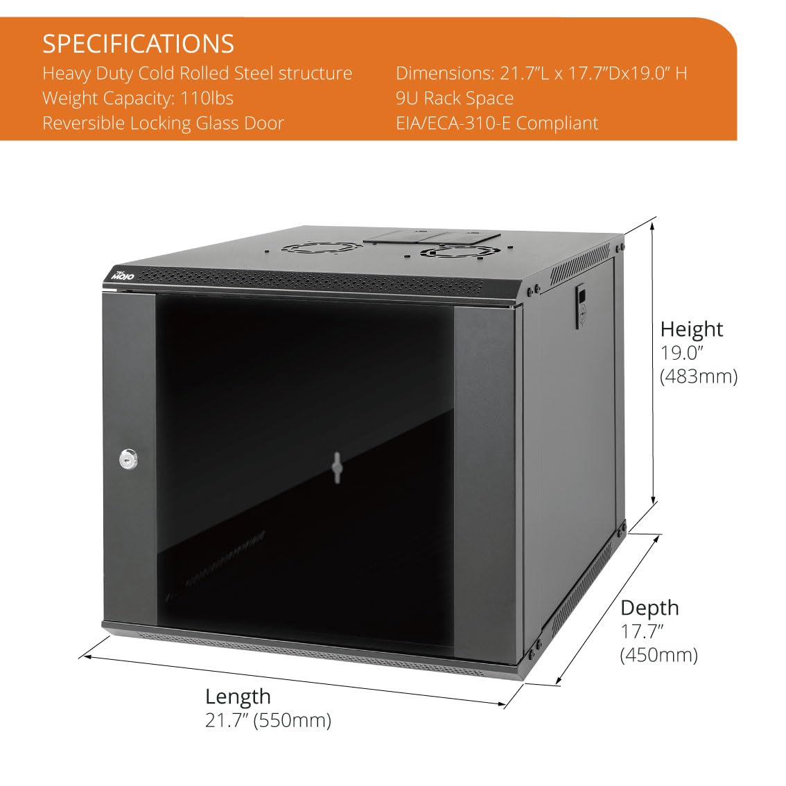 Tecmojo 9U Wall Mount Server Cabinet It Network Rack Enclosure Lockable Door And Side Panels Black,Cooling Fan, Glass Door, 17.7