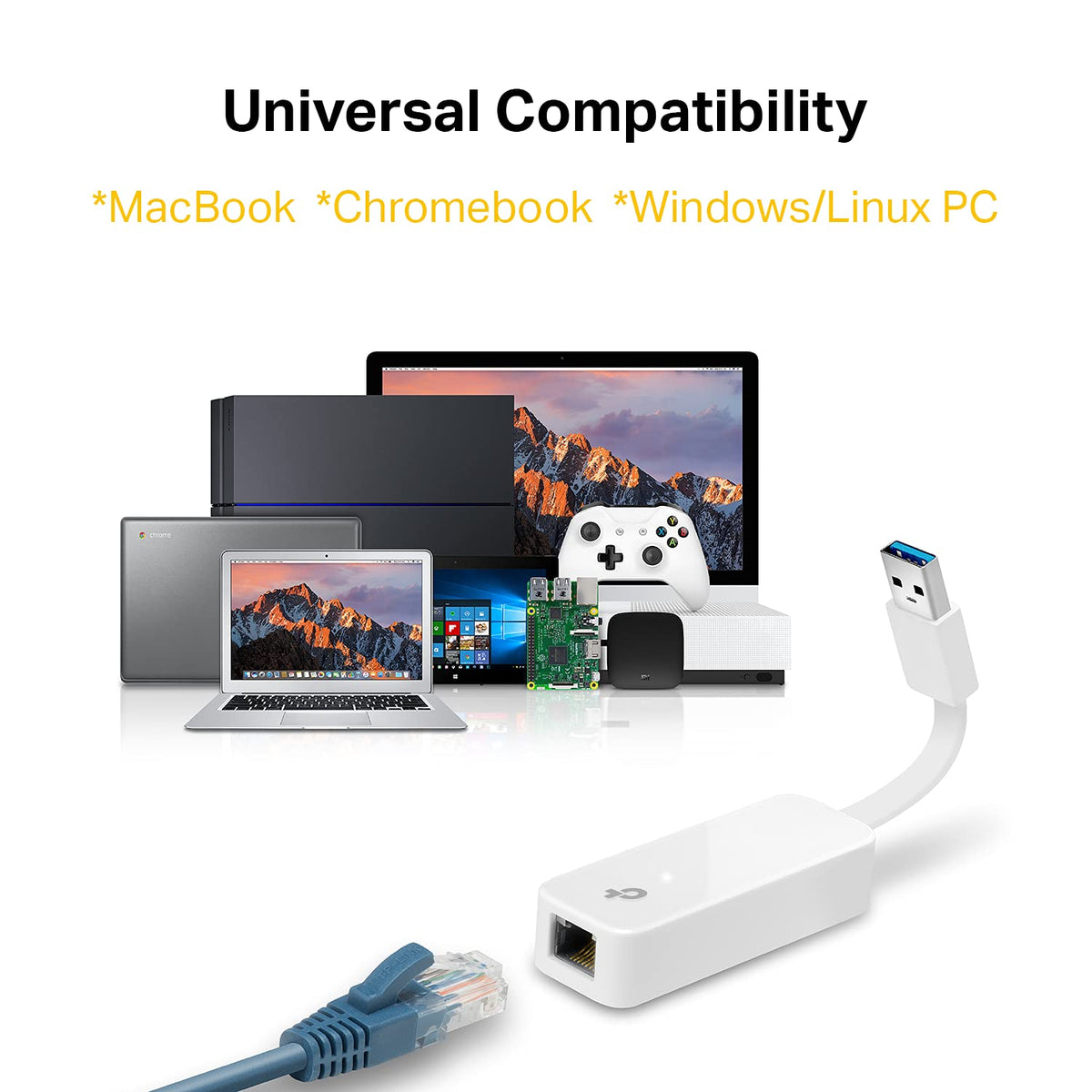 Q: What devices are compatible with the TP-Link USB to Ethernet Adapter?A: The TP-Link USB to Ethernet Adapter (UE300) is compatible with a variety of devices including MacBook, iMac, Chromebook, Surface, Windows PC, and Linux PC. However, it does not support gaming consoles like Nintendo Switch, Wii U, and Wii.