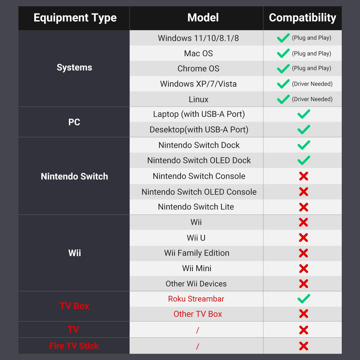 Q: What devices are compatible with the UGREEN USB-A to Ethernet Adapter?A: The UGREEN USB-A to Ethernet Adapter is compatible with a variety of devices including Nintendo Switch, Nintendo Switch OLED, laptops, desktops, Roku Streambar, and other USB-A devices. However, it is not compatible with Nintendo Switch Lite, Wii, other TV boxes, or all TV and Fire TV sticks.