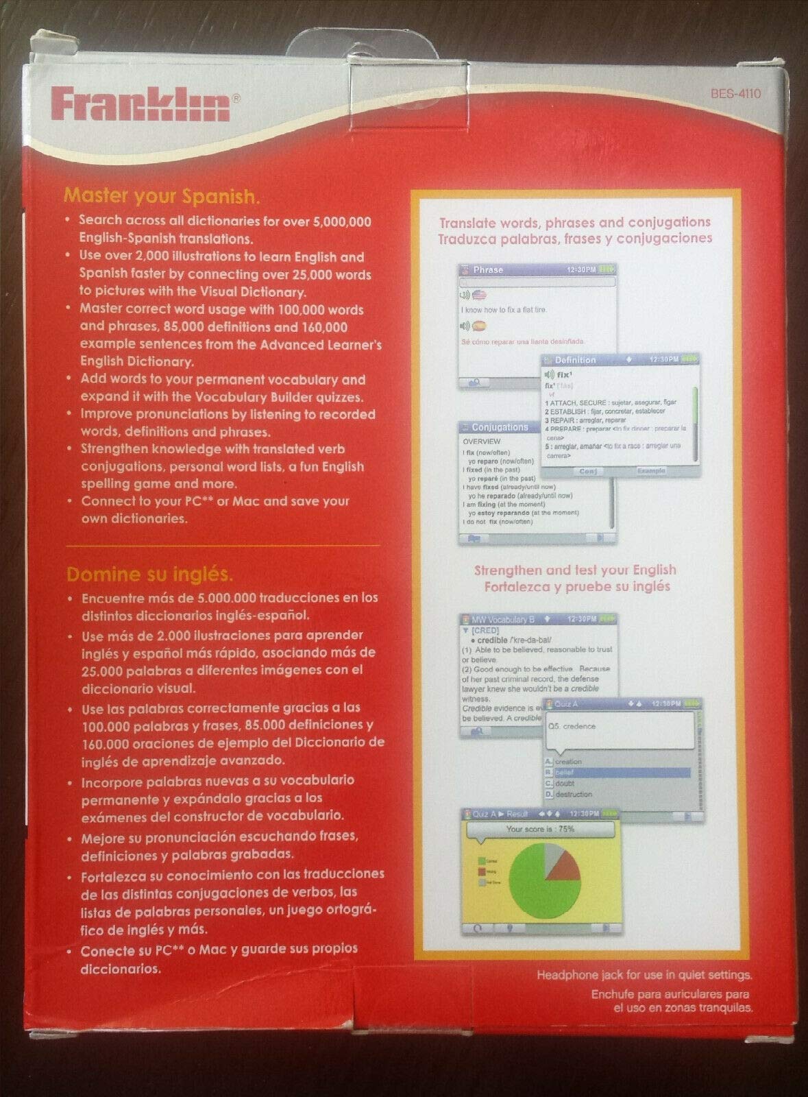 The Essential Learning Tool That Improves Reading, Writing, And Spelling. Globally Search All 12 Books Utilizing The 2.4' Color Lcm. You'Ll Be Satisfied With The Extensive Database Whether You Are A Native English Or Spanish Speaker To Search And Retrieve Information. The Bi-Directional Merriam-Webster'S Spanish-English Dictionary Speaks Headwords In Human Recorded Voice, The Complete Merriam-Webster'S Advanced Learner'S English Dictionary Speaks Headwords And Example Sentences In Human Recorded Voice. Strengthen Your Vocabulary With Merriam-Webster'S Vocabulary Builder And Interactive Quizzes. And If That New Word Isn'T Quite Familiar To You Utilize The English & Spanish Visual Dictionary Which Also Speaks. You'Ll Have Hours Of Fun Practicing Spelling English With Franklin'S Interactive Spelling Bee Game. Three Levels Of Play - Game Show, Practice And Competition. Two Additional Bonus Word Games Jumble And Hangman. Additional Content Included Are English & Spanish Grammar Guides, Toefl/Sat Word Lists, Franklin Thesaurus, Confusable And Phonetic Spell Correction So That You Can Sound Out The Entry Without Knowing The Correct Spelling.