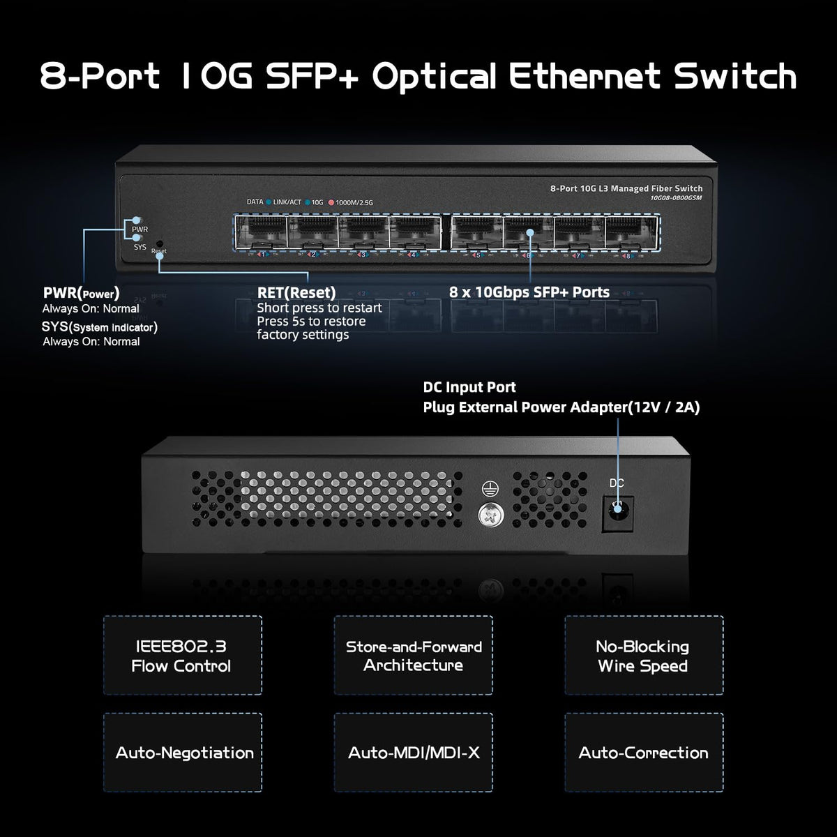 Binardat 8 Port 10 Gigabit Sfp+ Managed Switch, Support 1G/10G Sfp+ Module, 160Gbps Bandwidth, Web/Cli L3 Managed, Metal Fanless