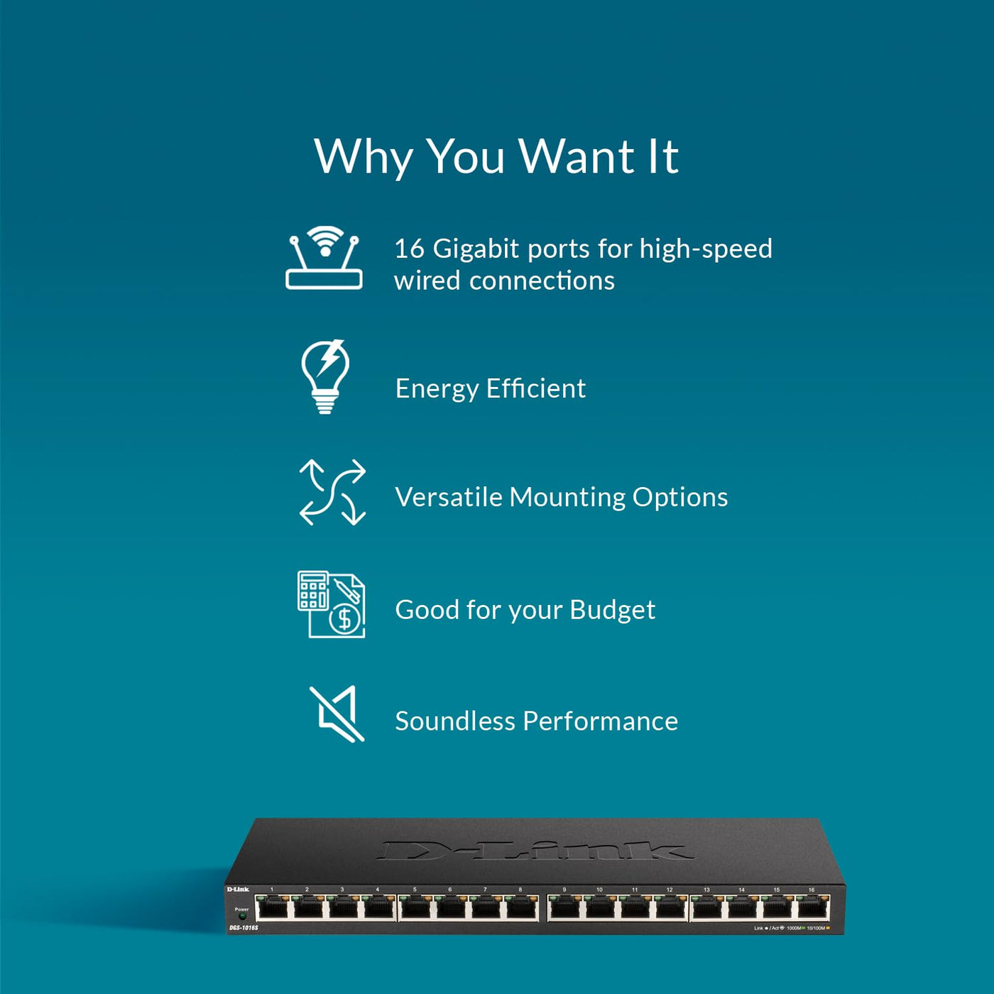 The D-Link 16-Port Gigabit Slim Switch (Dgs-1016S) Is Made To Connect, Expanding Your Home Network With Reliable Wired Connections You Can Count On As You Learn, Play, And Work At Home. Its Incredibly Thin Profile Measures At Less Than An Inch, And Simple Plug-And-Play Configuration Makes It A Snap To Install And Connect Numerous Devices. Plug In Your Laptop For Conferencing Over Gigabit Ethernet To Keep Your Video Stream Steady And Solid. Hardwire Smart Hdtvs, Streaming Boxes, And Game Consoles For Fast File Transfers, Smooth Streaming, And Twitch-Response Gaming. The Switch Is Built To Last And Fit Anywhere, Featuring A Compact All-Metal Case With Mounting Holes And Wall Mount Capability. Its Fanless Design Ensure Smooth And Silent Operation While D-Link Green Technology Efficiently Reduces Power Consumption, Optimizing Every Port Based On Link Status And Cable Length.