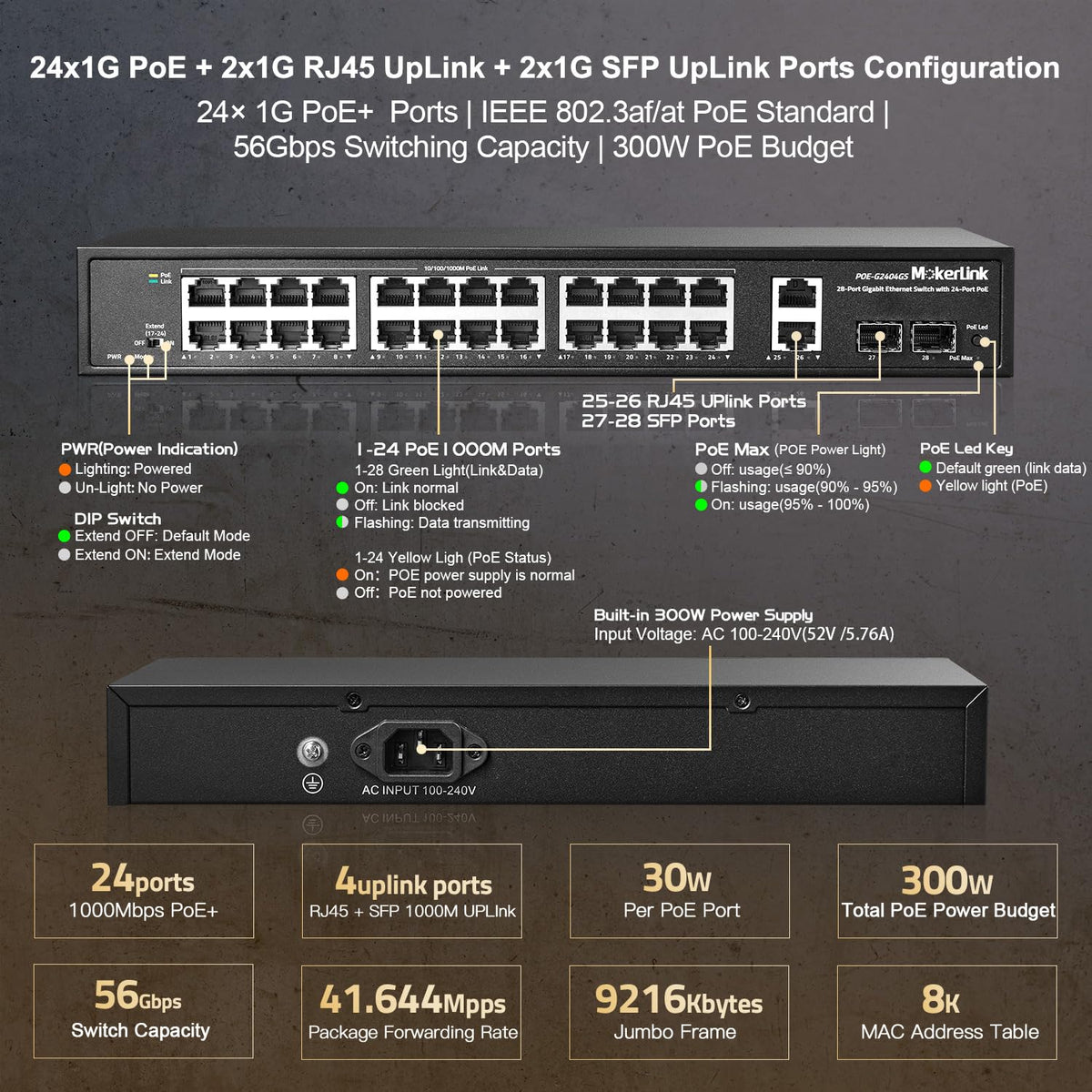 Mokerlink 28 Port Gigabit Poe Switch, 24 Gigabit Poe+ Ports, 2 Gigabit Uplink, 2 Gigabit Sfp, 300W Ieee802.3Af/At, Metal Rackmount Unmanaged Plug And Play Ethernet Switch