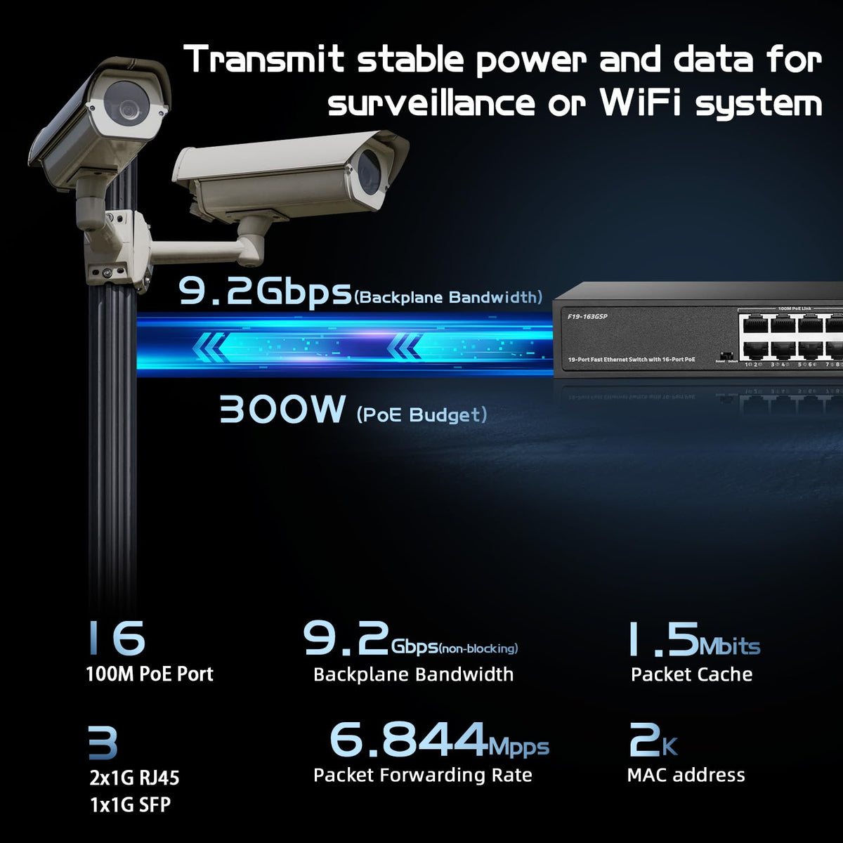 Binardat 19 Port Poe Switch, 16 Poe+ Ports 100Mbps, 2 Gigabit Uplink, 1 Gigabit Sfp, Ieee802.3Af/At, 300W Internal Power Supply, Metal Case Unmanaged Plug And Play
