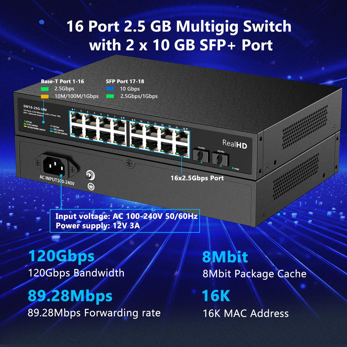 Real Hd 16 Port 2.5Gb Unmanaged Ethernet Network Switch With 16 X 2.5G Base-T Port, 2 X 10G Sfp+, Work With 10-100-1000Mbps, 120