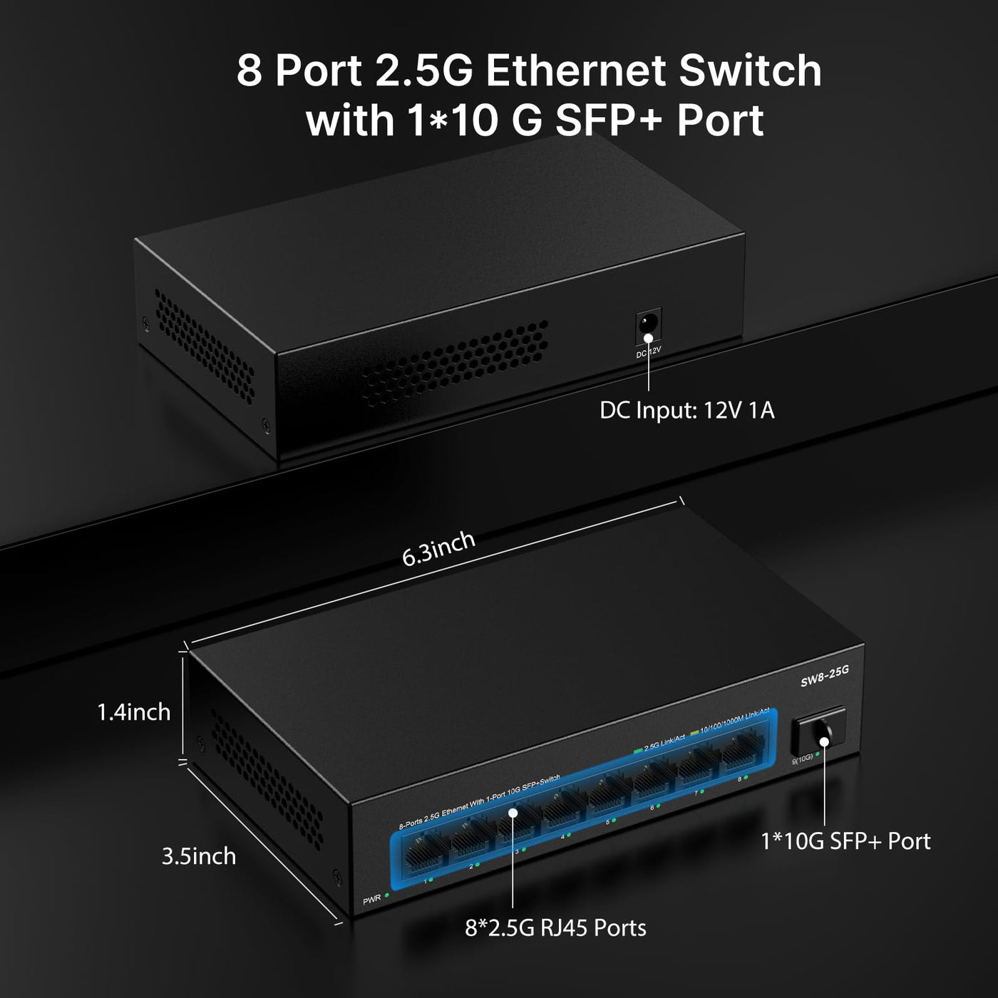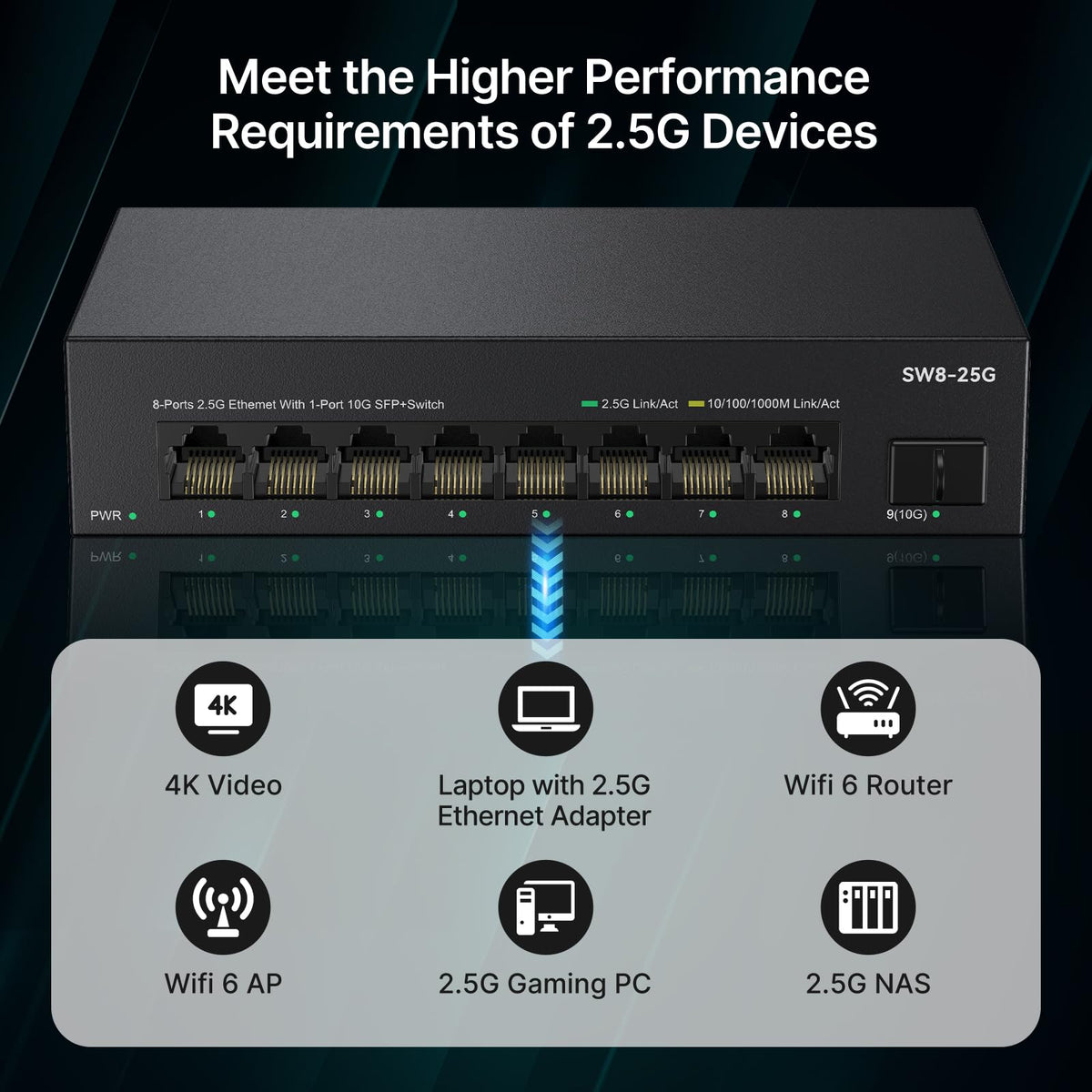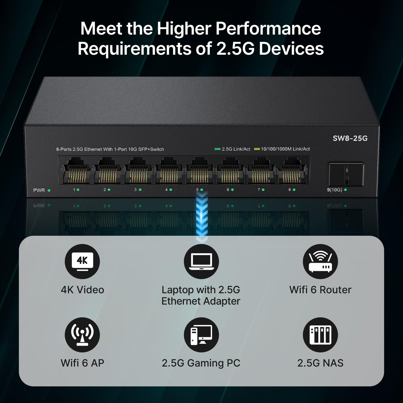 Real Hd 2.5G Ethernet Switch 8 Port Unmanaged Network Switch With 8 X 2.5 Gigabit Ethernet Ports | 1 X 10G Sfp+ Port | Multi-Gigabit Compatible With 10-100-1000Mbps Devices | 60G Bandwidth | Plug & Play | Fanless Quiet | Sturdy Metal Casing ?Plug And Play?Easy Setup With No Software Installation Or Configuration Needed For This Ethernet Switch. ?Sturdy And Quiet?Compact & Sturdy Metal Housing With 4Kv Lightning Protection Design Make This Network Switch Safe To Use In Various Environments. The Fan-Less Design Quietly Integrates With Your Office Environment And Featured Good Heat Dissipation, Safe To Use In Temperatures From -20 To 50?. ?2.5G Super-Fast?This 2.5 Gigabit Switch Features 8X 2.5G Rj45 Ports And 1X 10G Sfp Port, Providing Higher-Speed Connectivity For Your Devices And Allowing You To Easily Upgrade Your Network To Support The Latest 2.5G Ethernet Standard. ?Application?The Muti-Gigabit Switch Can Work With A Wide Range Of Ethernet Devices, Including 4K Video, Laptops With 2.5G Ethernet Adapter, Wifi 6 Router, Wifi 6 Ap,2.5G Gaming Pc,2.5G Nas Computers. To Achieve Better Performance, It'S Better To Upgrade All Your Devices To 2.5G To Get A Better Experience. ?Easy Upgrade?Works With Your Existing Cat5E, Cat6, Or Cat 6A Cables, Saving You The Hassle Of Running New Cables To Support The Higher Speeds. This 8 Port Ethernet Switch 2.5G Is Worth Your While!