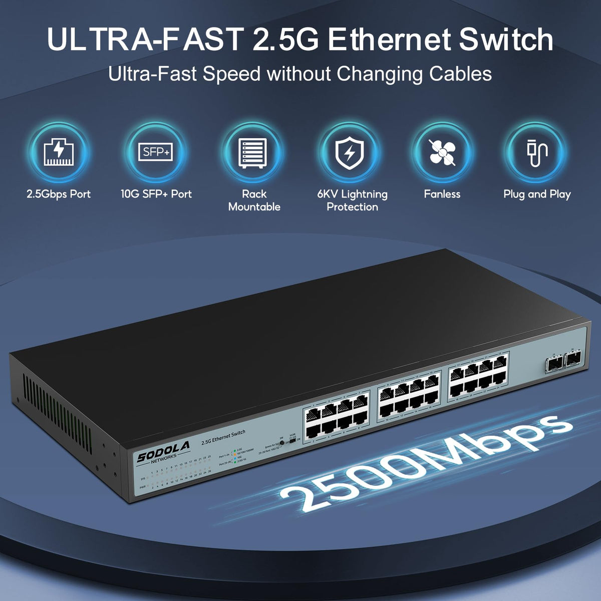 Sodola 24 Port 2.5Gb Umanaged Switch,24X2.5G Base T Ports,2X10G Sfp, 160Gbps Switching Capacity,Port Isolation,/Iu Rack Mount/Fa
