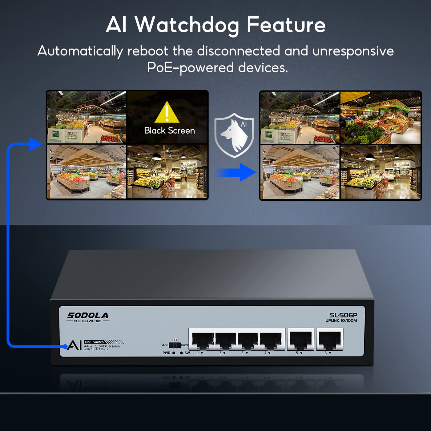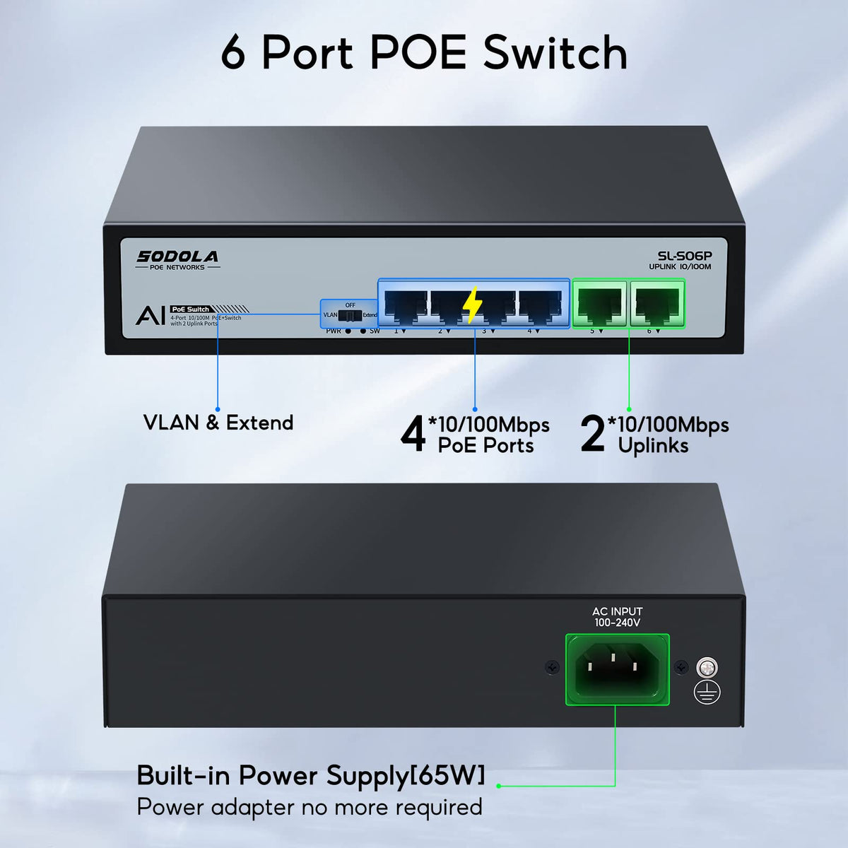 Active Poe Switch With 802.3Af/At Compliant: Poe Switches Support Poe Devices And Non-Poe Devices, But When Connecting Passive Poe Device Or Non-Poe Device, The Switch Can Only Transmit Data And Cannot Power Your Device, So The Connected Device Needs To Be Separately Powered. Or You Can Use It With Active Poe Splitter. 6 Port Poe Switch: Poe Switch With 4 Poe Port (10/100Mbps) + 2 Uplink Port(100Mbps ), 4 Poe Ports Providing Up To 30W Per Port, Total Poe Budget 65W. 2 Uplink Port For Connecting Nvr And Internet , Etc.. Vlan And Extend Mode: When The Vlan Switch Is Turned On, The Data Between The Poe Ports Does Not Interfere With Each Other, Independent Of Uplink Transmission, Making Data Transmission More Stable And Efficient. Turn On The Extension Switch, It Enters The Ai Mode(Poe Port Will Judge Whether It Enters The Ultra-Long Distance (820Ft/10Mbps) Mode According To The Actual Situation). Extend Function Extending Max Power And Data Transmission Distance From 100 Meters(330Ft) To 250 Meters(820Ft). Ai Watchdog Function: When The Data Or Electrical Transmission Between The Poe Port And The Terminal Device Is Abnormal, The Corresponding Poe Port Of The Device Will Automatically Detect The Problem And Restart The Connection.