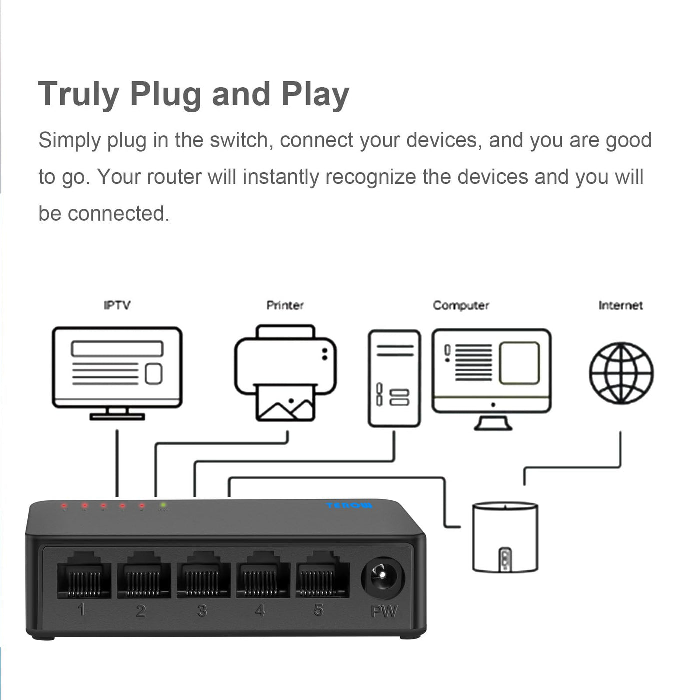 Terow 5 Port Gigabit Unmanaged Network Switch, Portable Switch | Plug & Play | Fanless Housing, Black