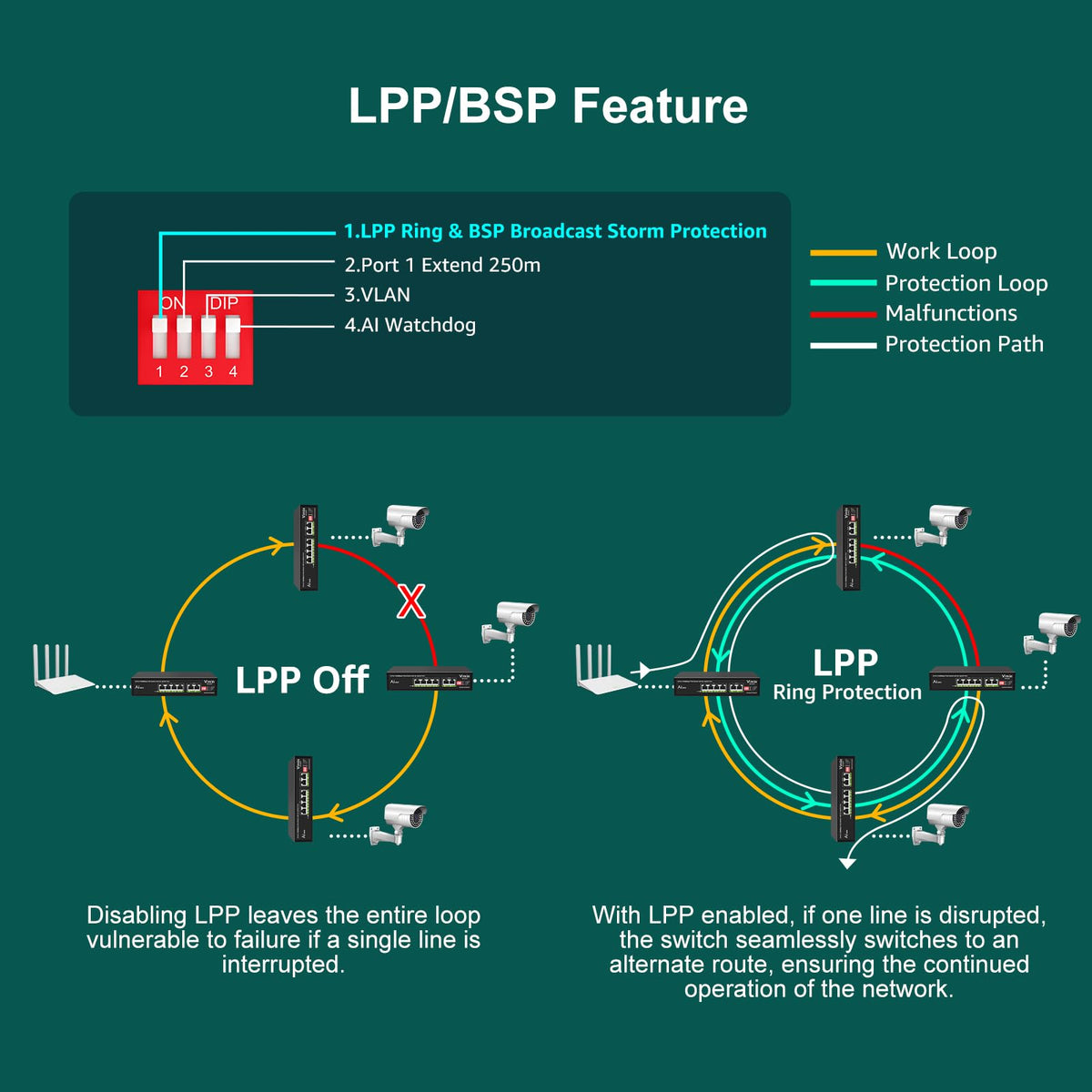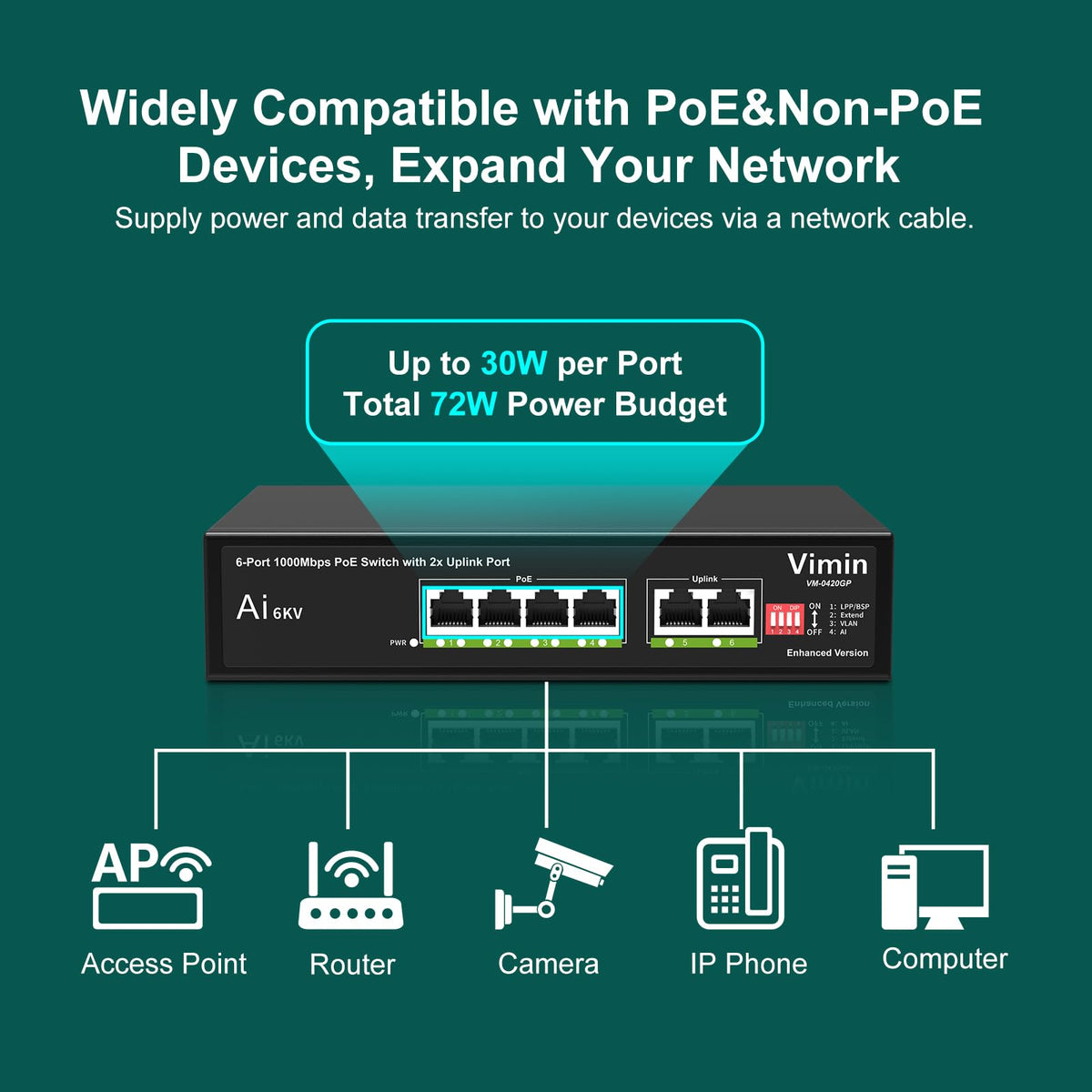 [Upgraded] 6-Port Gigabit Poe Switch With 4 Port Poe, Vimin 4-Port Unmanaged 10/100/1000Mbps Network Poe Switch With 2 Uplink Ports, Ai Watchdog, Vlan, Extend 250M, Support Ieee802.3Af/At
