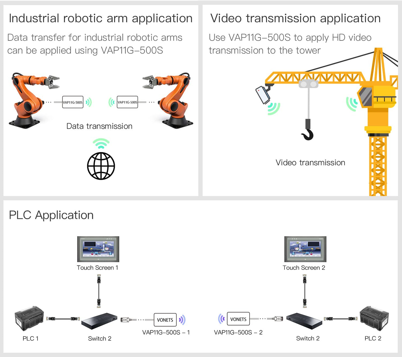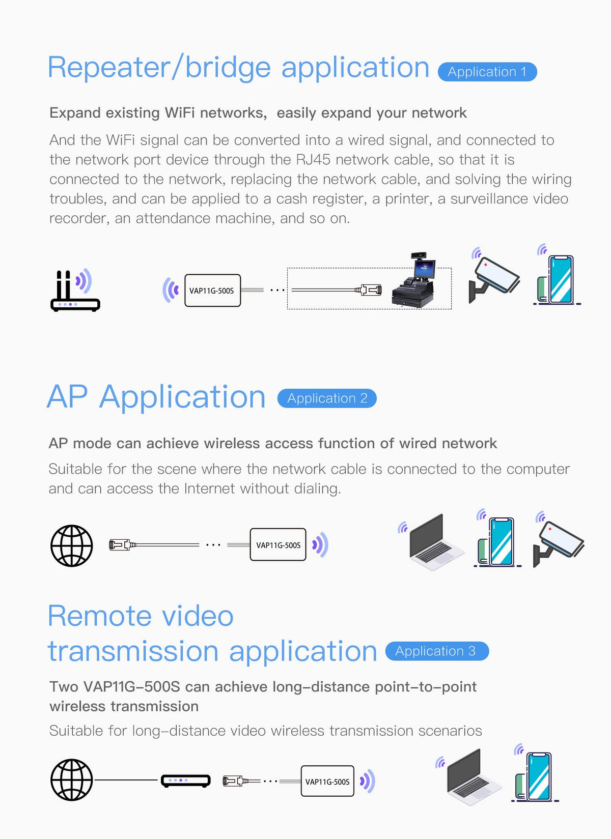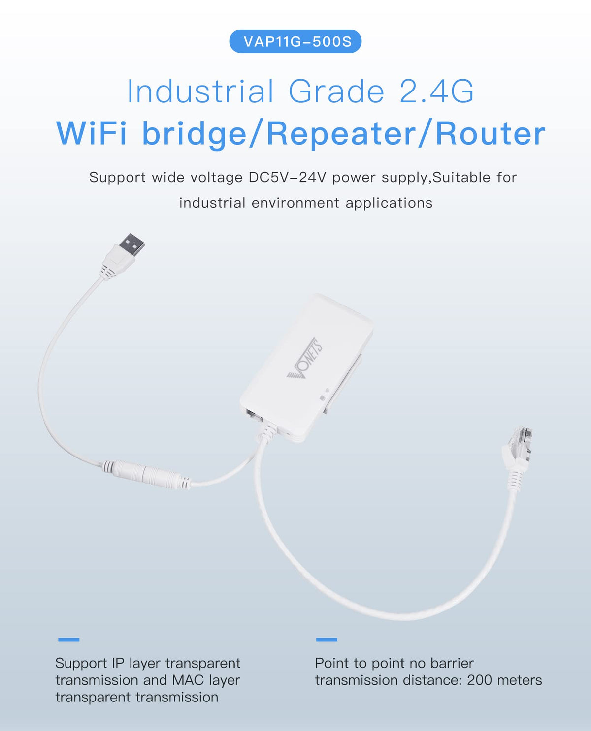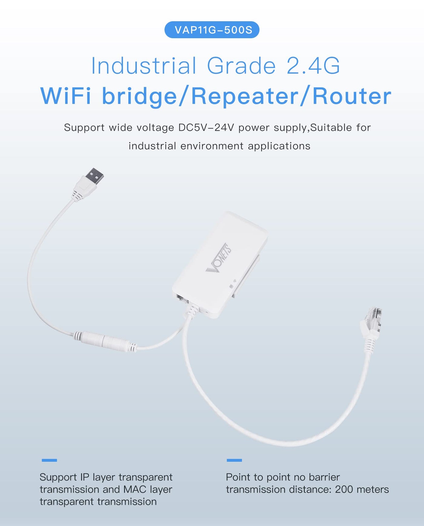 Vonets Vap11G-500S Is An Industrial 2.4Ghz Wifi Bridge/Mini Router/Wireless Repeater, Can Achieve Wifi To Wired Or Wired To Wifi Function (Ethernet To Wifi Or Wifi To Ethernet Convert)Product Description:Support Wide Voltage Dc5-24V Power Supply (Typically 5V/2A, Ripple Less Than 100Mv), Two-Stage Automatic Overvoltage Protection (Protection Voltage Upper Limit 27V);Support 802.11B/G/N Wifi Transmission Protocol; Wifi Transmission Rate: 2.4Ghz 300Mbps (Theoretical Value)Application Method:Wifi Router (Support Wifi Wan Uplink And Wan/Lan Exchange); Wifi Repeater (Wifi Signal Repeater), Can Extend Wifi Transmission Distance;Wifi Bridge: Ip Layer Transparent Transmission, Mac Layer Transparent Transmission;Wifi Access Point (Ap);Basic Function: (1) Wifi Hotspot Automatic Reconnection, Two Hotspot Matching Methods: Full Match Authentication Mode, Ssid And Password Authentication Mode; (2) Wifi Hotspot Memory Up To 100 Hotspots; (3) Ssa Signal Strength Detection And Reporting Function ; (4) Support Hotspot Connection And Configuration Parameter Import And Export Function To Facilitate Batch Configuration Of Engineering Projects;External Interface 1)Usb/Dc Power Supply Cable; 2)10/100M Adaptive Ethernet Cable; 3)10/100M Adaptive Ethernet Port (A Dedicated Ethernet Port Expander Can Be Used) Led Status Indication Ethernet Port (Cable) Status Light (Yellow); Wifi Connection Status Light (Blue);Packages: Vap11G-500S*1Industrial Dc Connector*1Fixing Kit*1User Manual*1 Retail Box*1Tips: Vap11G-500S Is The Upgraded Version Of Vap11G-500
