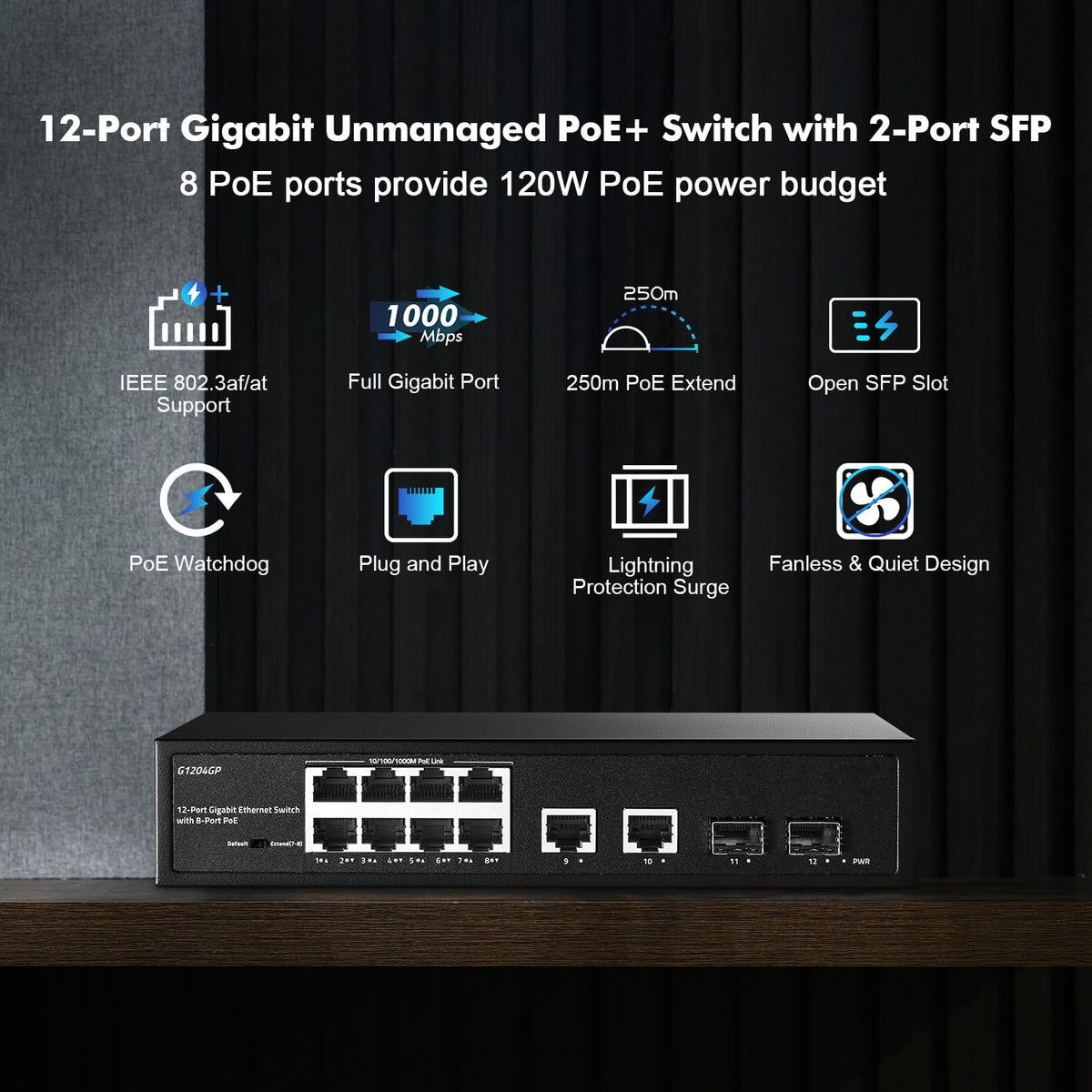 Yulinca 12 Port Gigabit Poe Switch, 8 Ge Poe+, 2 Ge Uplink, 2 Gigabit Sfp, Ieee802.3Af/At Max 120W, Fanless Unmanaged Plug&Play Ethernet Switch