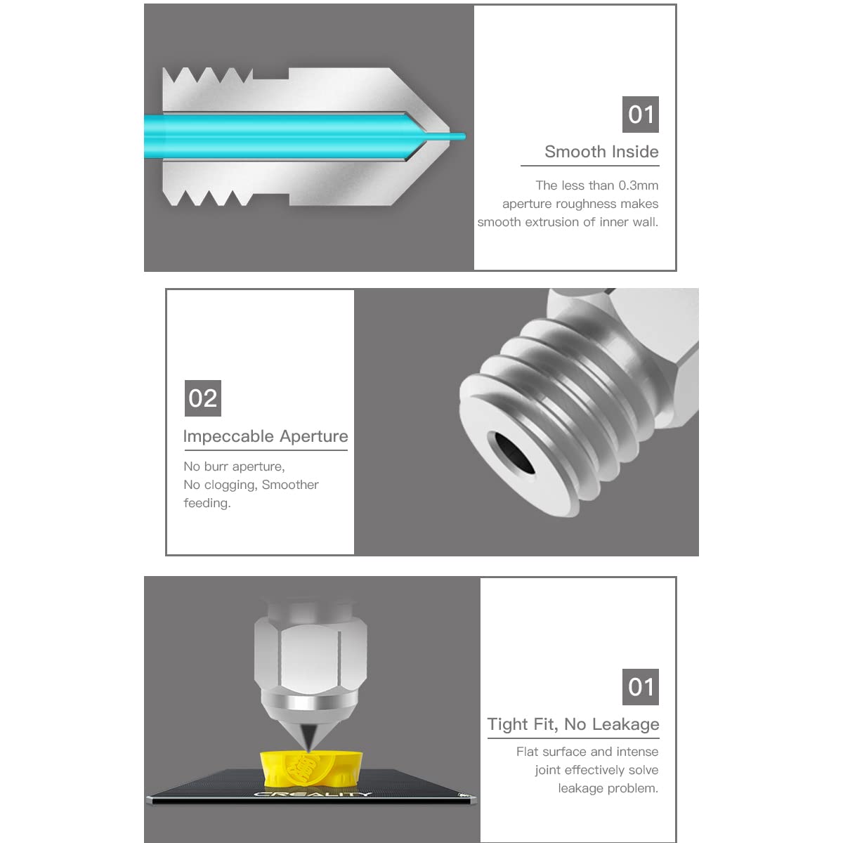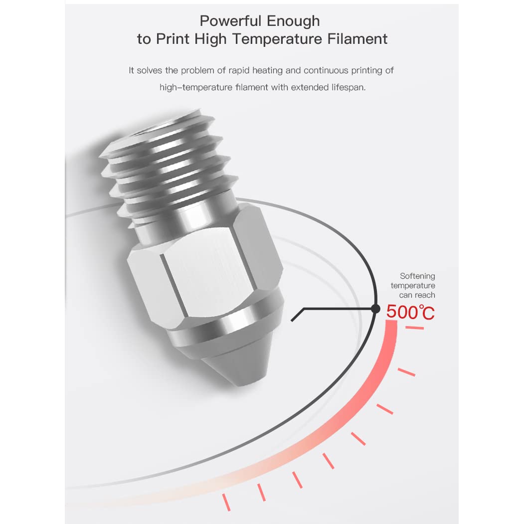 Q: How can I prevent filament leakage when using this nozzle?A: The seamless junction between the nozzle and heatsink effectively prevents filament leakage and breakage, minimizing printing issues. Ensure proper installation and regular maintenance to maintain optimal performance.