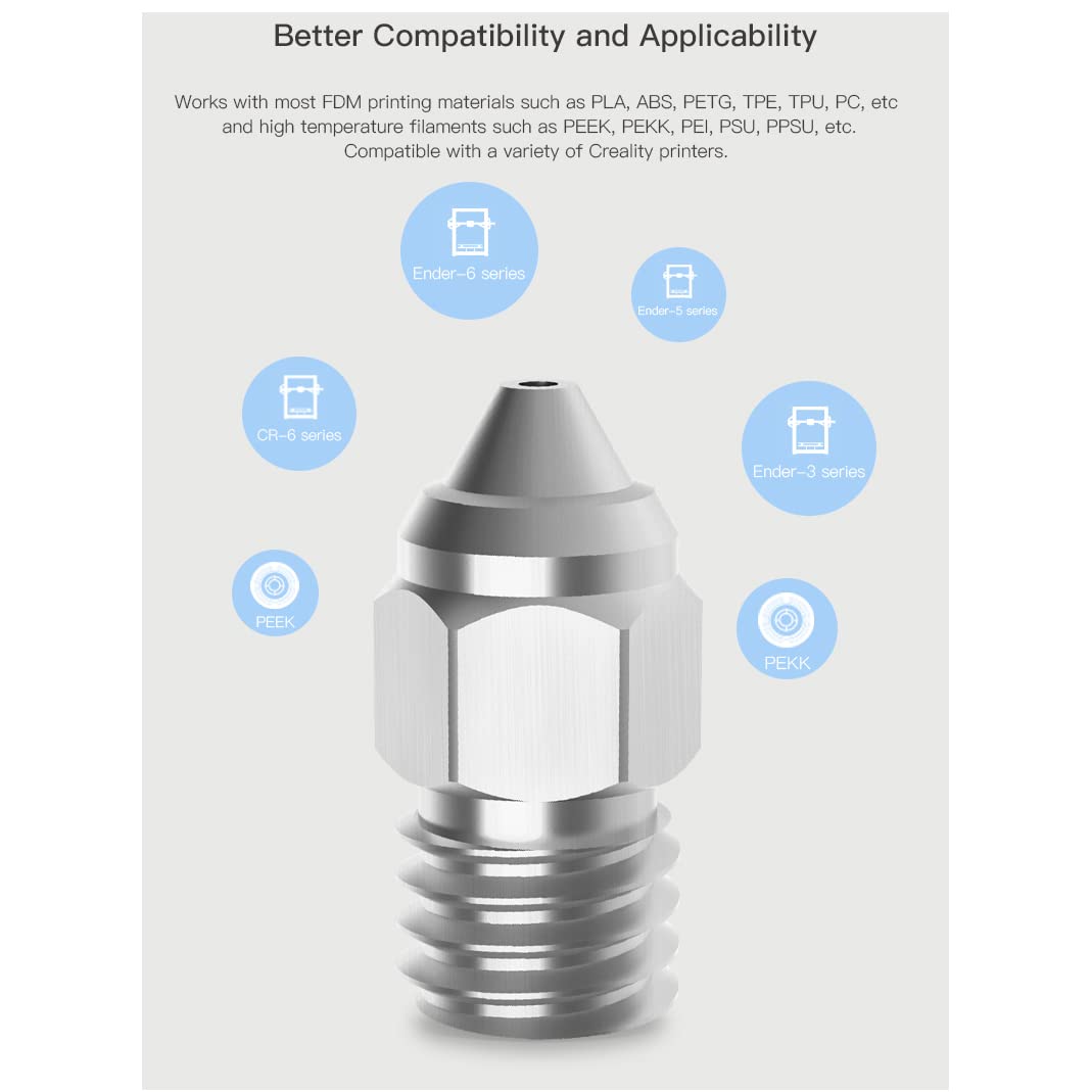 Q: Is the 0.4mm nozzle compatible with my 3D printer?A: This 0.4mm nozzle is compatible with various models including CR-6 SE, CR-6 MAX, CR-5 PRO, Ender series (3, 3 Pro, 3 V2, 3 Max, 5 Pro, 5 Plus), CR-10, and CR-10 V2/V3. However, it does not fit CR-10S PRO or CR-10 MAX.