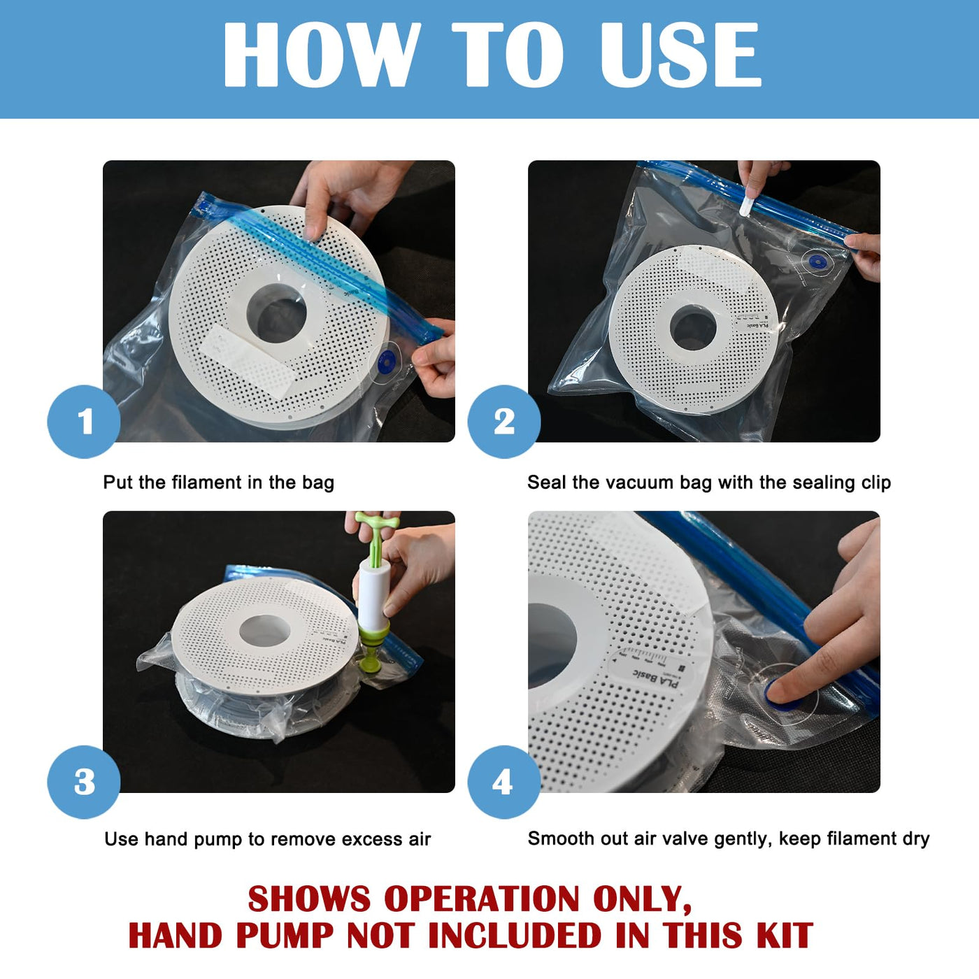 Tiopy Reusable 3D Filament Reel Sealed Storage Bags Seriesthe Condition Of The Filament You Use Is What Determines The Quality Of Your Prints, And Choosing Tiopy 3D Printer Filament Storage Kit Makes It Easy For You To Keep Your Filament In Top Condition.Specification:Made Of Robust Pe+Pa Composite Materialstronger, Tougher, More Airtight, And More Moisture Resistant&Nbsp;Pack1: Filament Bag X 10, (11.8X13.4Inch For 1 Kg Spool), Zip Sealer Clips X 2,Reusable Desiccant X 20&Nbsp;Pack2: Filament Bag X 20, (11.8X13.4Inch For 1 Kg Spool), Zip Sealer Clips X&Nbsp; 2,Reusable Desiccant X 20,Hand&Nbsp; &Nbsp; Pumps X 1Pack3: Filament Bag X 20, (11.8X13.4Inch For 1 Kg Spool), Vacuum Bags X5 (12.6X17.7Inch&Nbsp; For Two 1 Kg Spool)Zip Sealer Clips X&Nbsp; 2,Reusable&Nbsp; &Nbsp; Desiccant X&Nbsp; 30,Automatic Pumps X 1Pack4:Filament Bag X 30, (11.8X13.4Inch For 1Kg Spool), Zip Sealer Clips X&Nbsp; &Nbsp; &Nbsp;2,Automatic Pumps X 1Effectively Keep Filaments From Moisture And Dustversatile Filament Compatibility From 0.25 Kg To 1 Kg Spoolsthe Convenient Vacuum Seak Bags For Pla,Petg,Tup,Pls,Pha,Abs Filament And More&Nbsp;Effortless Vacuum Sealing In 30 Seconds With Pumpthick 0.26 Mm Material, Durable And Reusableclips Included For Easy Sealingnotice:When Using The Bag For The First Time, Due To The Tight Sealing Of The Membrane At The Valve, If There Is Difficulty In Manually Pumping Air, Please Pump 10-15 Times.&Nbsp;You Can Also Choose To Use An Automatic Pump That Pumps In Just A Few Seconds To Help You Be More Efficient!