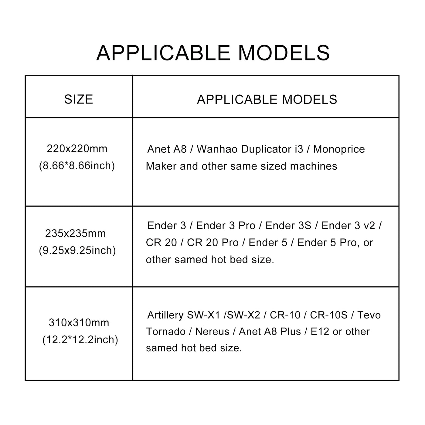 ?Compatibility?It Is Applicable With Ender 3/ Ender 3 Pro/ Ender 3S/ Ender 3 V2/ Cr 20 / Cr 20 Pro / Ender 5 / Ender 5 Pro, Or Other Hot Bed Size 235X235Mm/9.2X9.2In Model.(Please Measure Your Hot Bed And Make Sure It Is The Right Size For You). | ?No Edge Curling?Using The Coated Tempered Glass Bed, Molds Could Be Stuck On The Bed Firmly Without Glue, Which Can Avoid The Issue Of Print Edges Curling. It Is A Necessary 3D Printer Upgraded Platform. | ?Super Convenient?The Models Can Be Easy To Taken Off By Hands Without Any Tools. This Tempered Glass Bed Could Be Cleaned With Alcohol Or Acetone At Room Temperature. | ?Excellent Flatness?The Improved 3D Printer Glass Bed Provides More Flat And More Smooth Build Surface Than Magnetic Mat Or Pei Spring Steel, Ensuring Higher Flatness For The Bottom Of Model. The Thickness Deviation Is Between 0.2Mm (Generally 0.1Mm) | ?Highly Cost Effective?The Tempered Glass Bed Comes With 4Pcs Clips. They Can Help To Fix The Glass Plate On The Hot Bed More Easily.