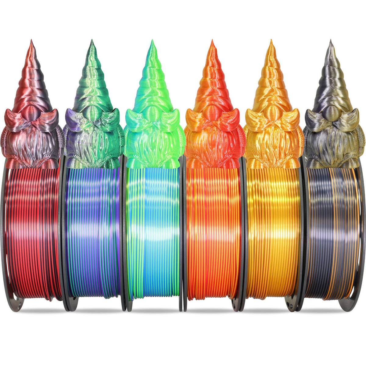 Do You Want One Bundle Silk Dual Color Pla Include Shiny Multi Different Colors? To Print The 3D Objects In Unique Multi Colored Silk Luster Colors ? Our Store Dual Color Silk 2 Color In 1 Silk Pla Filament Satisfy You, We Have More Of 25 Different Dual Color In 1 Silk Pla Free At Your Choice, Its Support Your Innovation And Design In 3D Printing World Very Well!# Specification: Material: 2 Color In 1 Silk Pla 3D Filament( Polylactic Acid) Diameter Accuracy:1.75Mm+/-0.05Mm Recommended Printing Temperature: 401-446?(205-230?)Recommended Printing Speed:30-60 Mm/S; Recommended Heat Bed: 122-140?(50?-60?) Quantity: 6 Spools In One Package, Each Spool Filament Net Weight Is: 0.25Kg, Total 1.5Kgs Silk Pla Filament Bundle In This Package 6 Colors Of Silk Dual In 1 Pla: Silk Red-Gold; Silk Red-Black; Silk Black-Orange; Silk Gold-Copper; Silk Lime Green-Blue; Silk Green-Purple Each Spool Packed By Vacuumed Sealed Bag, Total 6 Spools Packed By One Big Box Together Extra Gift: One Premium Quality 3D Printer Tool: One Bottle Solid Stick Printer Tool Together With This Package After-Sale Service We Are Confident About Our Silk Pla Filament Quality, Contact Us If You Have Any Question, We Are Always Here To Serve You Best! To Create 3D Art And Start Your 3D Printing Now! Tips: 1. It S Better To Use 0.4Mm Or Larger Nozzle With Our Store Filament 2. Pls Pack The Filament In Sealed Bag Or Box After Use 3. All Of Our Filament Are 100% Tangle-Free Before Package Open, To Avoid Tangle Problem, Pls Insert The Free End Of The Filament Into Spool Holes After Each Time Printing