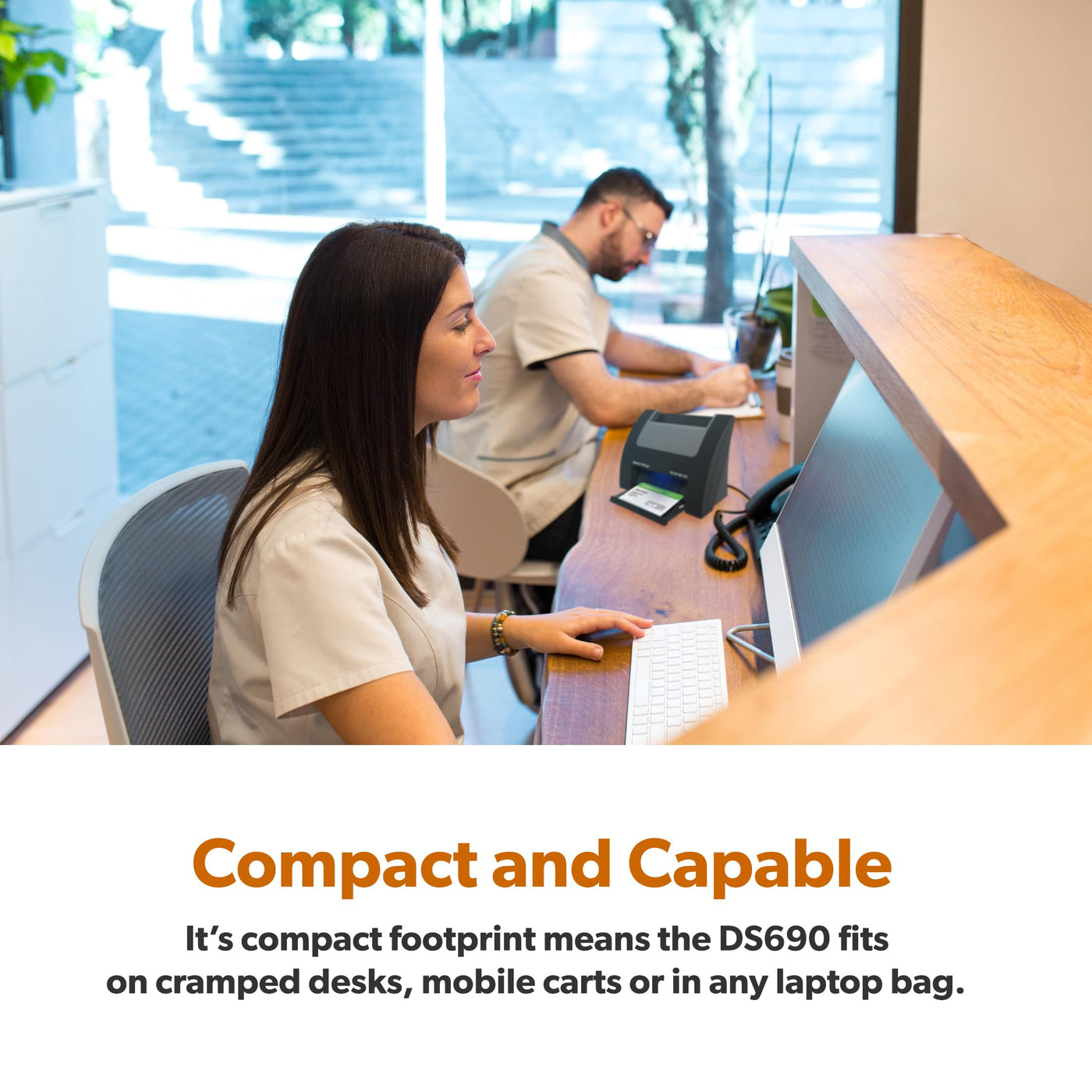 Creating A Quick And Smooth Process With Vertical Card Scanning. Fast, One Second Scanning For Both Sides Of Ids And Insurance Cards. Beautiful Image Quality In Color Or Grayscale. And It Takes Up Even Less Desk Space Than Your Current Scanner. The Nscan 690Gt Is Ideal For Use In Customer, Patient Or Guest Facing Services. Its Unique Design Is Well Suited For Front Desks And Use On Mobile Carts In Healthcare.