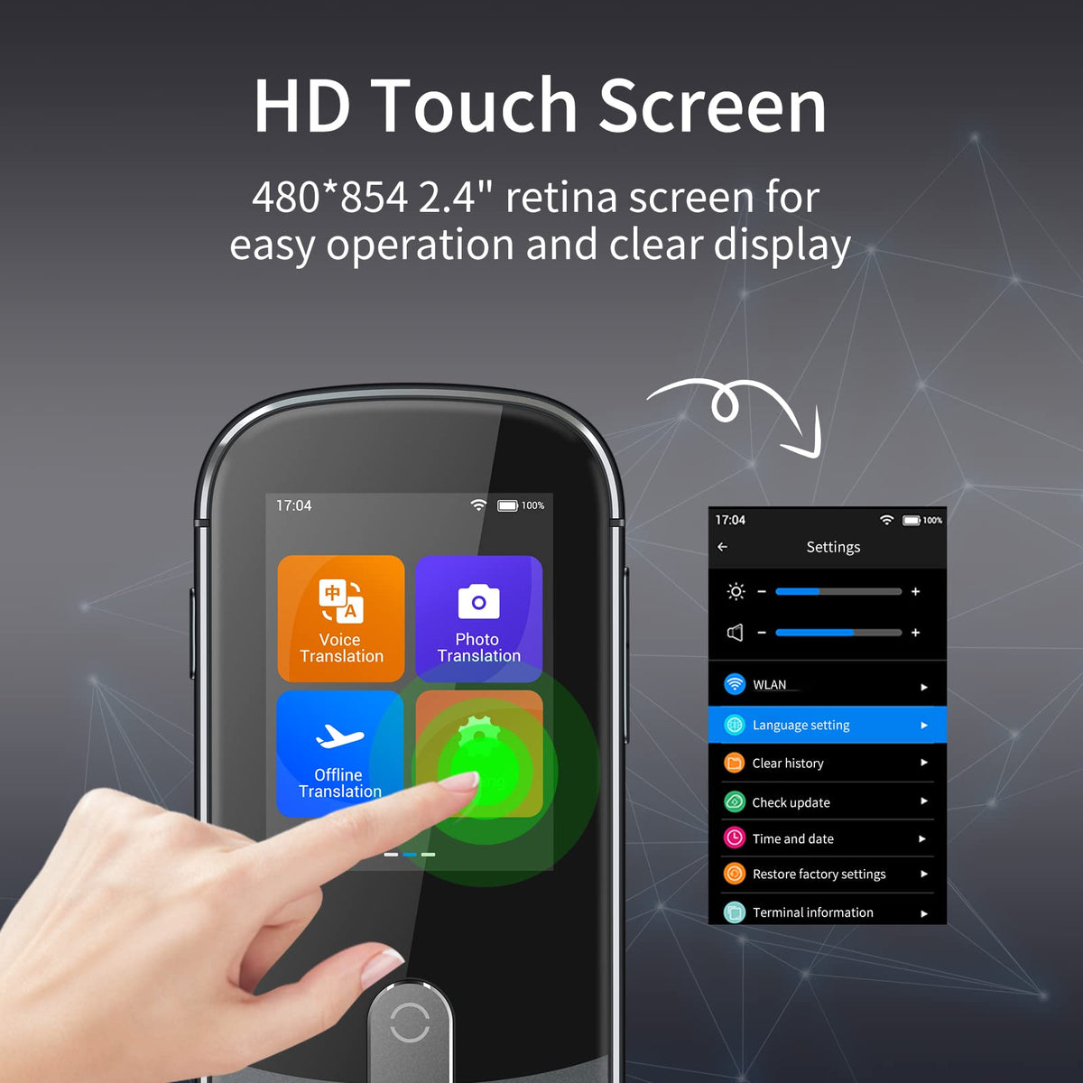 Q: What features enhance the voice translation capability of the Anfier device?A: The Anfier Language Translator features high precision voice translation with a response time of less than 0.5 seconds, enabling clear voice broadcasting or text display on the screen for easy communication.
