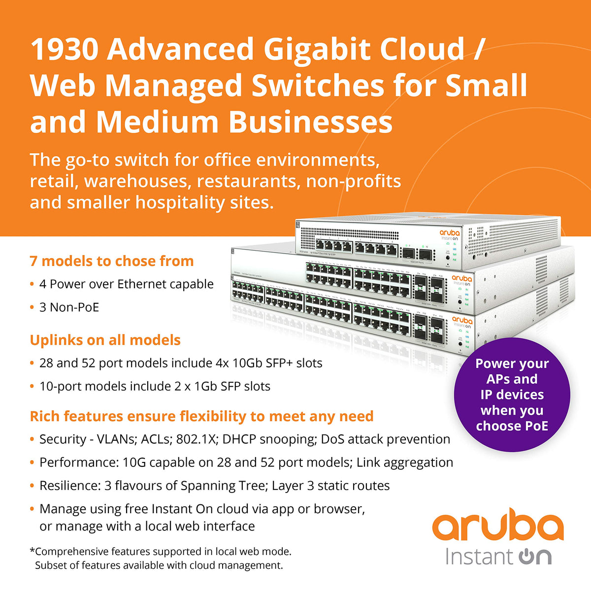 Overview:Aruba Instant On 1930 10-Port Poe Gigabit Ethernet Smart Cloud Web Managed Switch W 8 X Ge Poe (124W), 2X 1G Sfp Jl681A Us Cord Desktop Or Rack Fanless L2+ Routingfor Small And Growing Businesses, A Reliable And Secure Network Plays A Critical Role In The Success Of Your Business In Todays Connected World, Home And Remote Office Environments Also Need Fast, Affordable, Reliable Networking All Need A Network Solution That Gives Peace Of Mind, Allowing You To Focus On Your Business Pirorites, Elevated Connected Experiences, And Not On Managing Your Network Aruba Instant On Makes It Easy To Keep Network Users Happy, Mobile And Iot Devices Connected, And Your Network Secure The Aruba Instant On 1930 Switches Features Advanced, Smart-Managed, Fixed Configuration Gigabit Switches Designed For Small Businesses That Are Easy-To-Deploy And Affordable Theyare Made To Handle Todayas Bandwidth-Heavy Applications Like Voice And Video Conferencing, Enabling Consistent Connectivity To Enhance Performancehighlights:Simplicity At Its Bestplug-And-Play Switches That Work Together With Instant On Aps Right Out Of The Boxmobile App To Easily Setup, Monitor And Manage Your Networksecurity You Can Count Onprotect Your Network From Unauthorized Access With Ieee 8021X And Vlansautomatic Denial-Of-Service (Dos) Monitors And Protects The Network Against Malicious Attacksweve Got You Coveredno Extra Licensing Or Subscription Feeindustry-Leading Limited Lifetime Warranty And Support