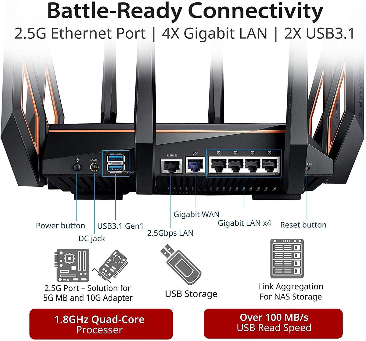 Asus Rog Rapture Wifi 6 Wireless Gaming Router (Gt Ax11000) Tri Band 10 Gigabit, 1.8Ghz Quad Core Cpu, Wtfast, 2.5G Port, Aime