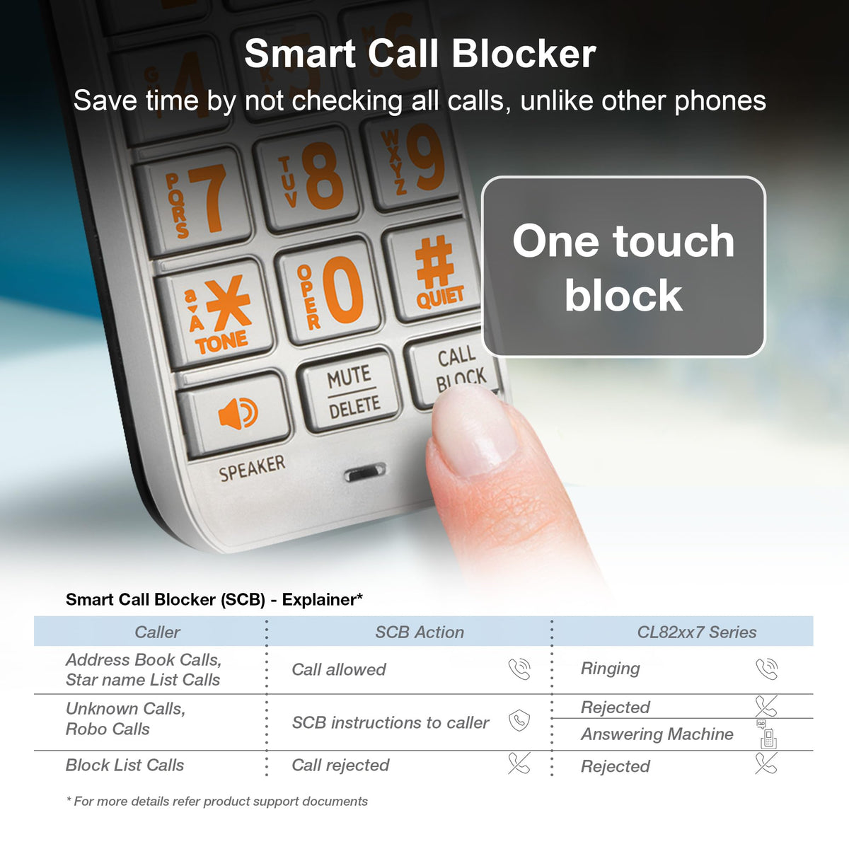Q: How does the Smart Call Blocker feature work?A: The Smart Call Blocker automatically prevents robocalls from ringing through, and you can also permanently blacklist any number with a single touch on the dedicated key.