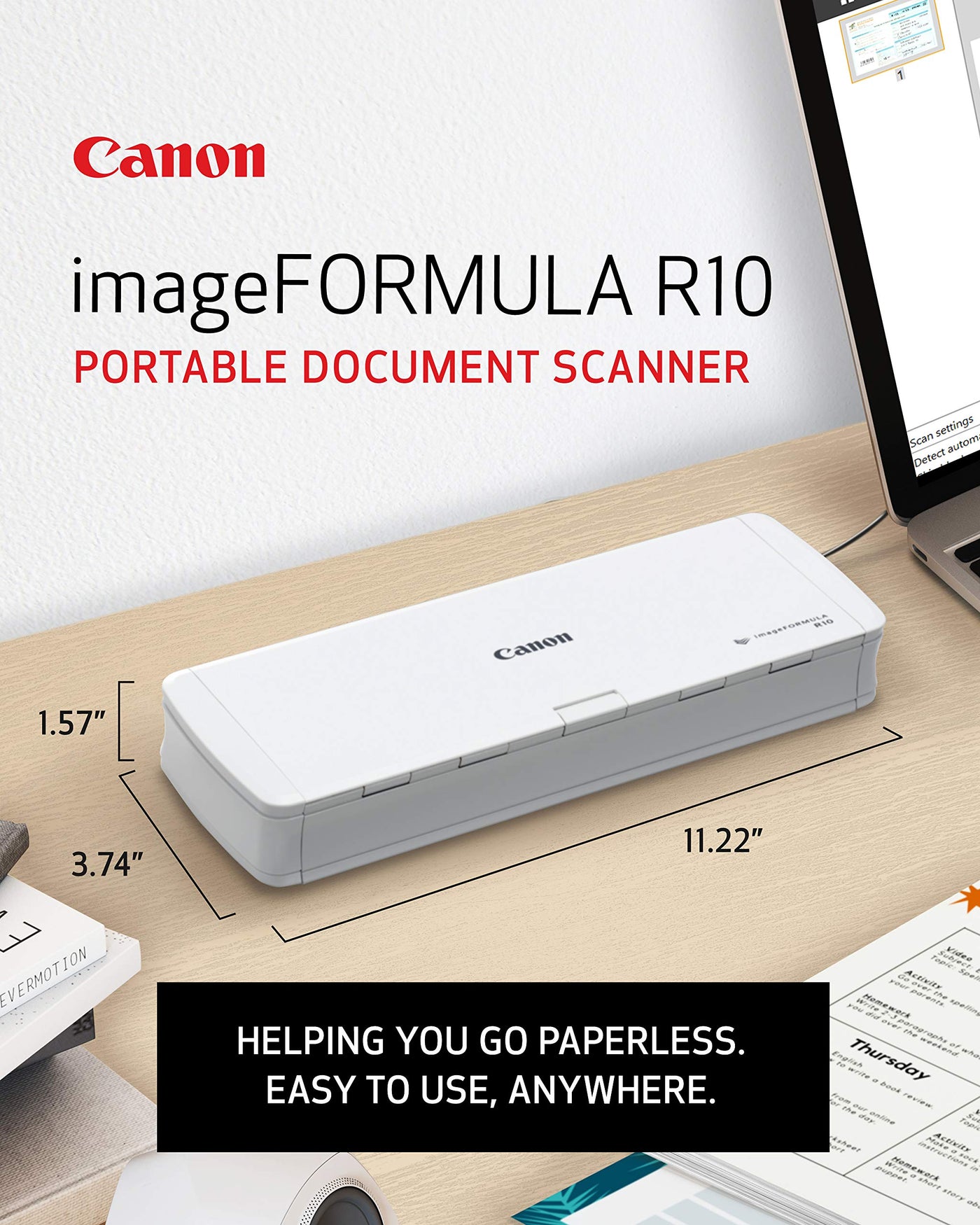 Go Paperless Anywhere Work Takes You With The Canon Imageformula R10 Portable Document Scanner. This Easy To Use Scanner Lets You Digitize Whatever Documents, Receipts, Business Cards, Or Family Records You Need Saved And Organized. Being Both Windows And Mac Compatible, The Simple Usb Cable Gives You Connectivity At Home, The Office, While Traveling, Or Working Remotely. This Small Scanner Is Fast And Effective With Color Or Black-And-White Duplex Scanning, Speeds Of Up To 12 Pages-Per-Minute, And A 20 Sheet Automatic Feeder. Built-In And Powerful Software Saves You Time As It Comes Programmed To Update Automatically. Edit And Adjust On-The-Go As This Portable Document Scanner Gives You Access To High-Resolution Images Of Your Scans That Can Be Edited On The Fly. Enjoy Superior Customer Care On Your Energy-Efficient Scanner With A One-Year Warranty And Access To Canon'S Friendly And Knowledgeable Support Team.