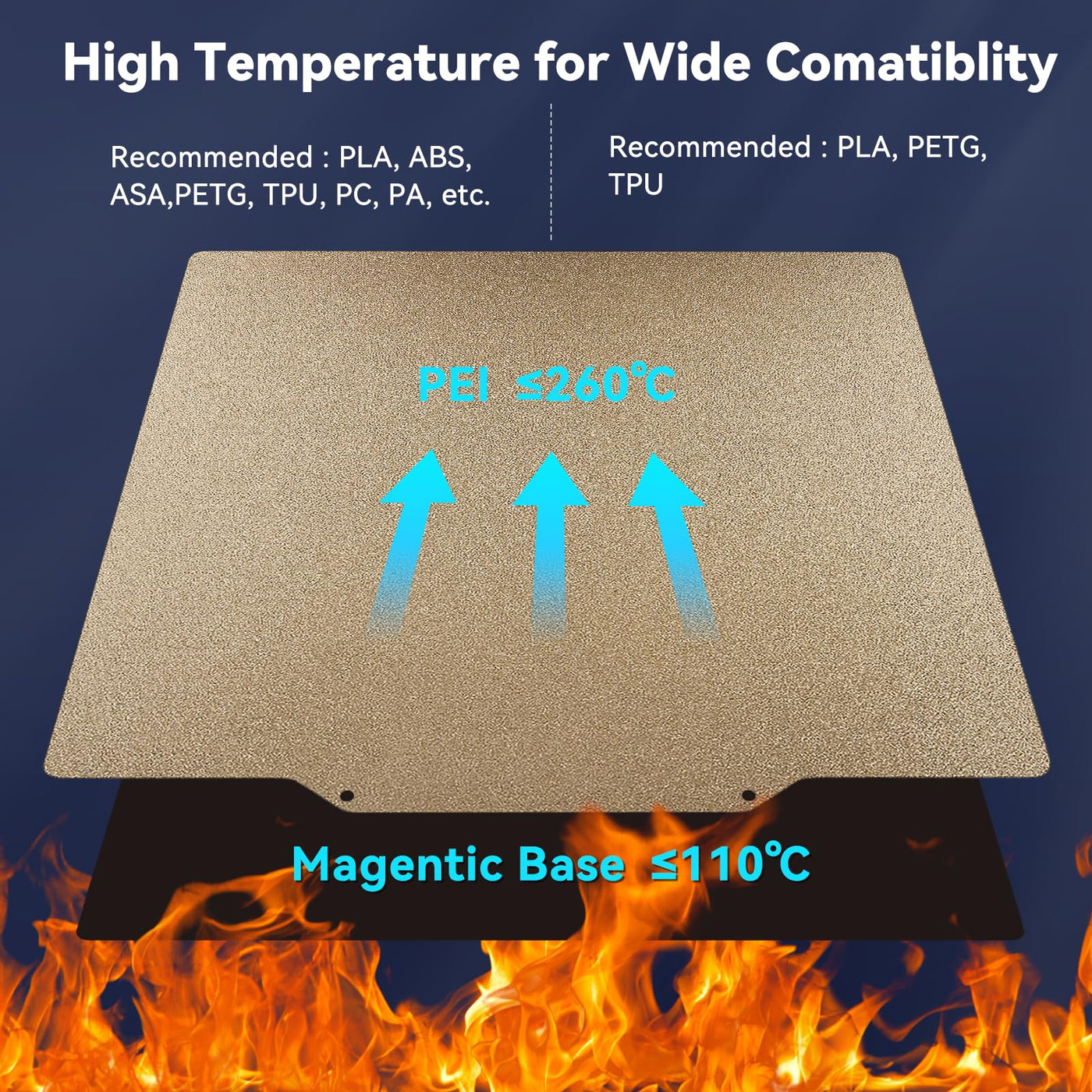 Cctree Pei Spring Steel Plate Double Sided Textured Pei Sheet And Magnetic Sticker With Adhesive New Ideal Upgrade 3D Printer Platform Kit! Size:330*330Mm Package Include:1X Double Sided Pei Heated Bed Sheet Compatible For Elegoo Neptune 3 Plus / 4 Plus A30/A30 Pro, Tronxy X3S/X5S/X5S Pro, Qid1 X-Max3 Etc. Compatible With Pla?Petg?Peek?Abs And Any Other Filaments. Excellent Adhesion Can Be Achieved When The Temperature Of The Heated Bed Is About 60?, You Can Print Directly On Each Side Of The Double-Sided Pei Sheet Without Using Any Glue Or Other Tools To Help The Model Stick Onto The Sheet. You Do Not Need To Worry About The Prints Curling With A 60? Bed Temperature. It Also Can Print Petg Very Well, But The Temperature Of The Hotbed Needs To Be About 80-85? Package Included: 1X Double Sided Pei Heated Bed Sheet