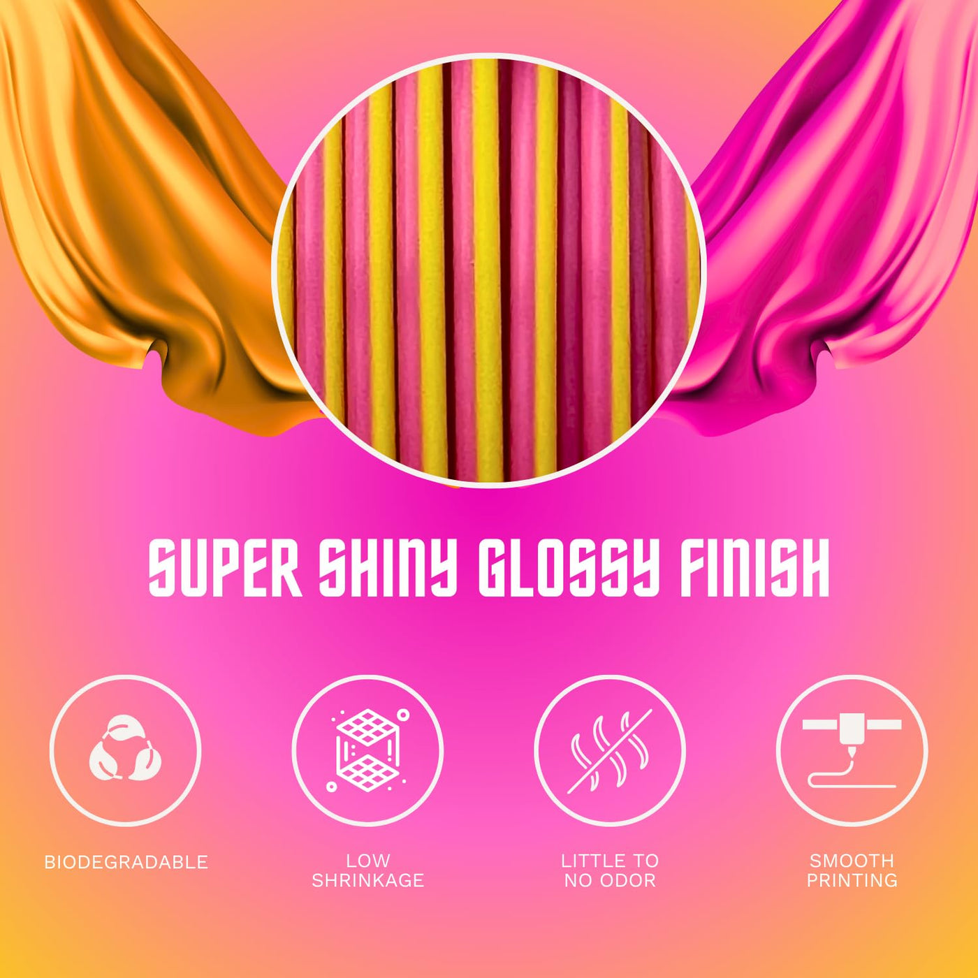 Q: What is Cookiecad Silk PLA Filament and what makes it unique?A: Cookiecad Silk PLA Filament is a 3D printer filament made from Polylactic Acid (PLA) that features a unique dual-color silk coextrusion. This innovative filament allows you to print two colors simultaneously, creating stunning color-changing effects, particularly from pink to yellow. Its super shiny finish adds a glossy appeal, making it ideal for decorative items and artistic projects.