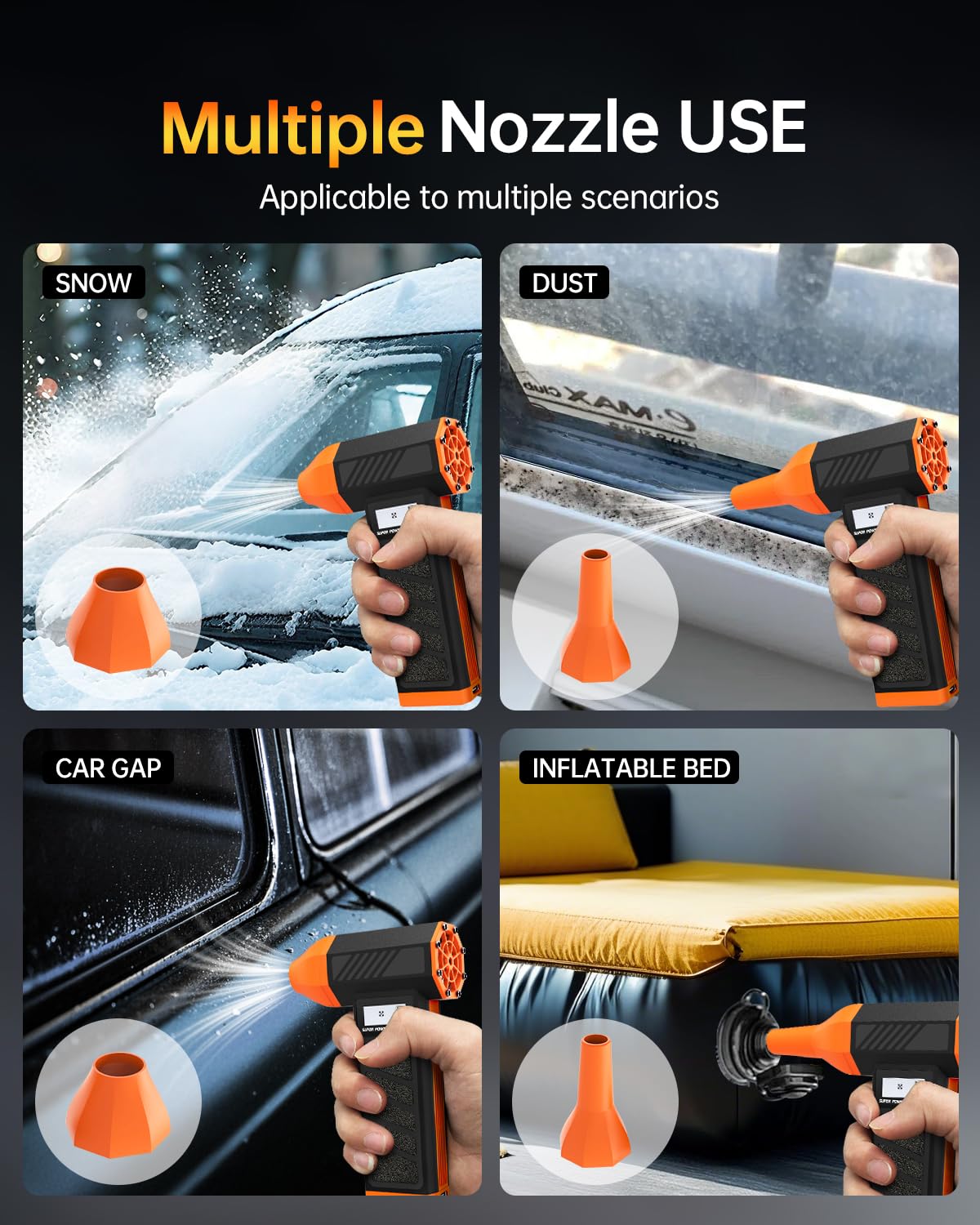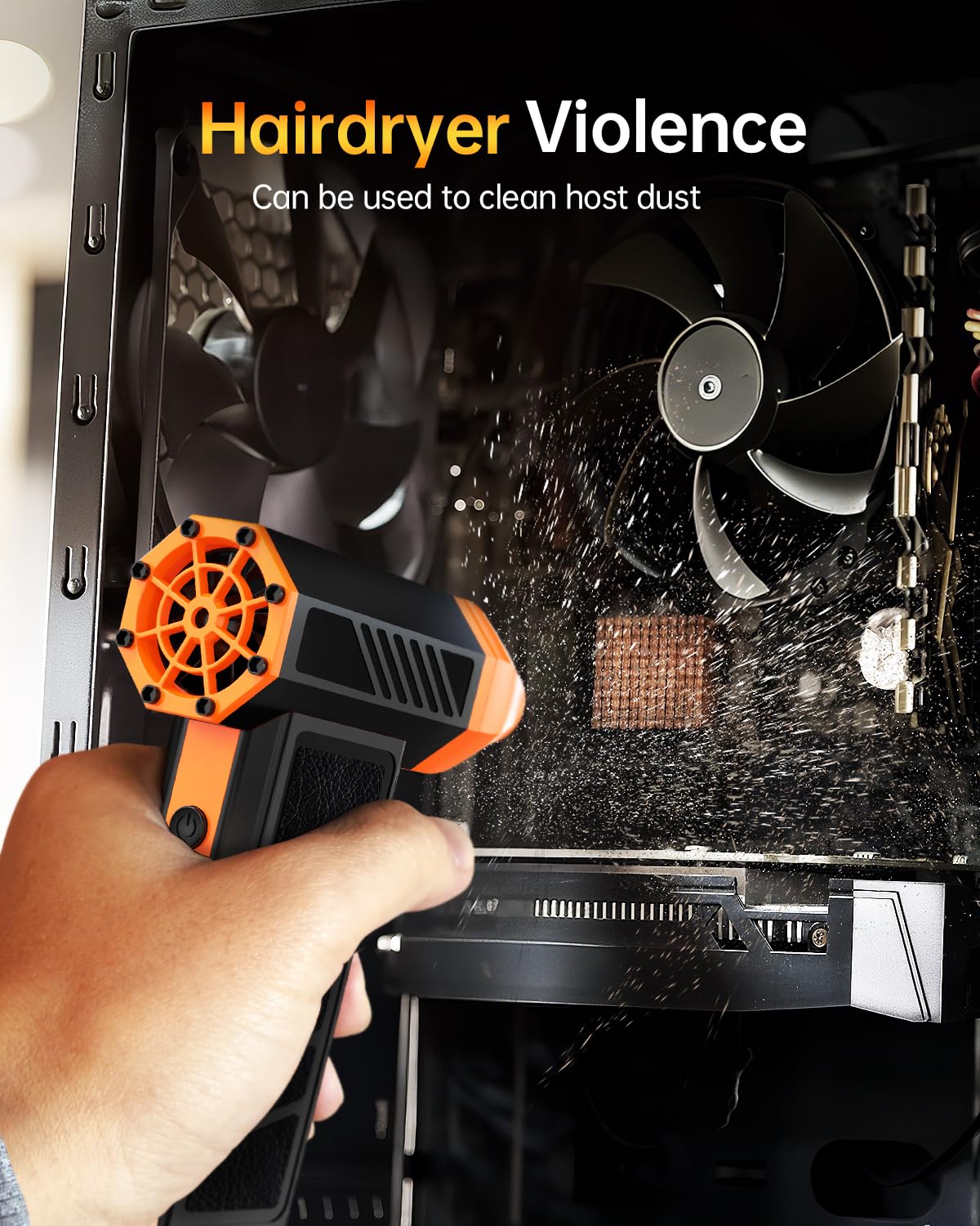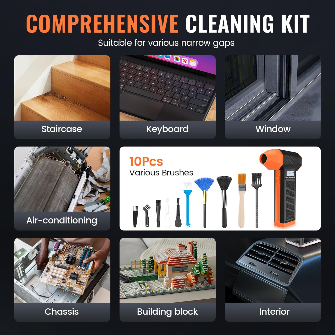 Experience Superior Cleaning Power With This Professional-Grade Compressed Air Duster. The Ergonomic Design Features A Sturdy Black And Orange Housing With Textured Grip Panels For Secure Handling During Use. The High-Performance Turbo Fan Delivers Powerful Bursts Of Air Through The Precision Nozzle Attachments, Making It Perfect For Removing Dust And Debris From Electronics, Keyboards, Camera Equipment, And Other Sensitive Devices. The Interchangeable Nozzle System Includes Multiple Attachments For Versatile Cleaning Applications - From Broad Surface Areas To Tight Corners And Crevices. This Durable Air Duster Is An Essential Tool For Maintaining Electronics And Equipment, Offering Consistent Performance Without The Drawbacks Of Traditional Canned Air Products. The Comfortable Grip And Intuitive Controls Make It Easy To Direct Precise Bursts Of Air Exactly Where Needed. Keep Your Valuable Equipment Clean And Functioning Optimally With This Reliable Cleaning Solution.