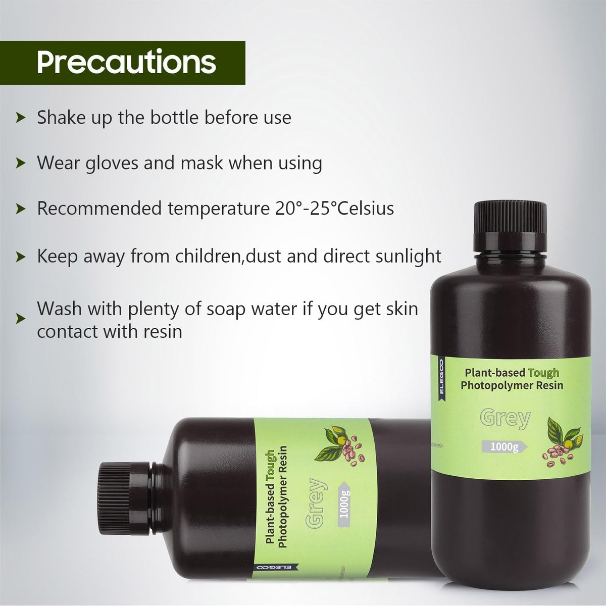 Elegoo Plant-Based 3D Printer Resin Is Safe And With Ultra-Low Irritant Chemical Composition.Product Features:1. Using Soybean Oil As Raw Material, Bpa-Free, Natural Green Lcd Light-Curing Material That Complies With En 71-3:2013.2. Fast Curing And No Deformation During The Molding Process, The Surface Of The Finished Product Is Smooth And High Precision.3. The Finished Product Has Good Strength And Flexibility, Excellent Molding And Impact Resistance, And With Some Elasticity.Exposure Parameter:Bottom Exposure: 20-60Snormal Exposure: 1.5-15Sresin Parameter:Hardness: 80-84D;Viscosity (25C): 200-400 Mpasliquid Density: 1.05-1.25 G/Cmsolid Density: 1.05-1.25 G/Cm Fflexural Strength: 19.8610% Mpaextension Strength: 27.4610% Mpa